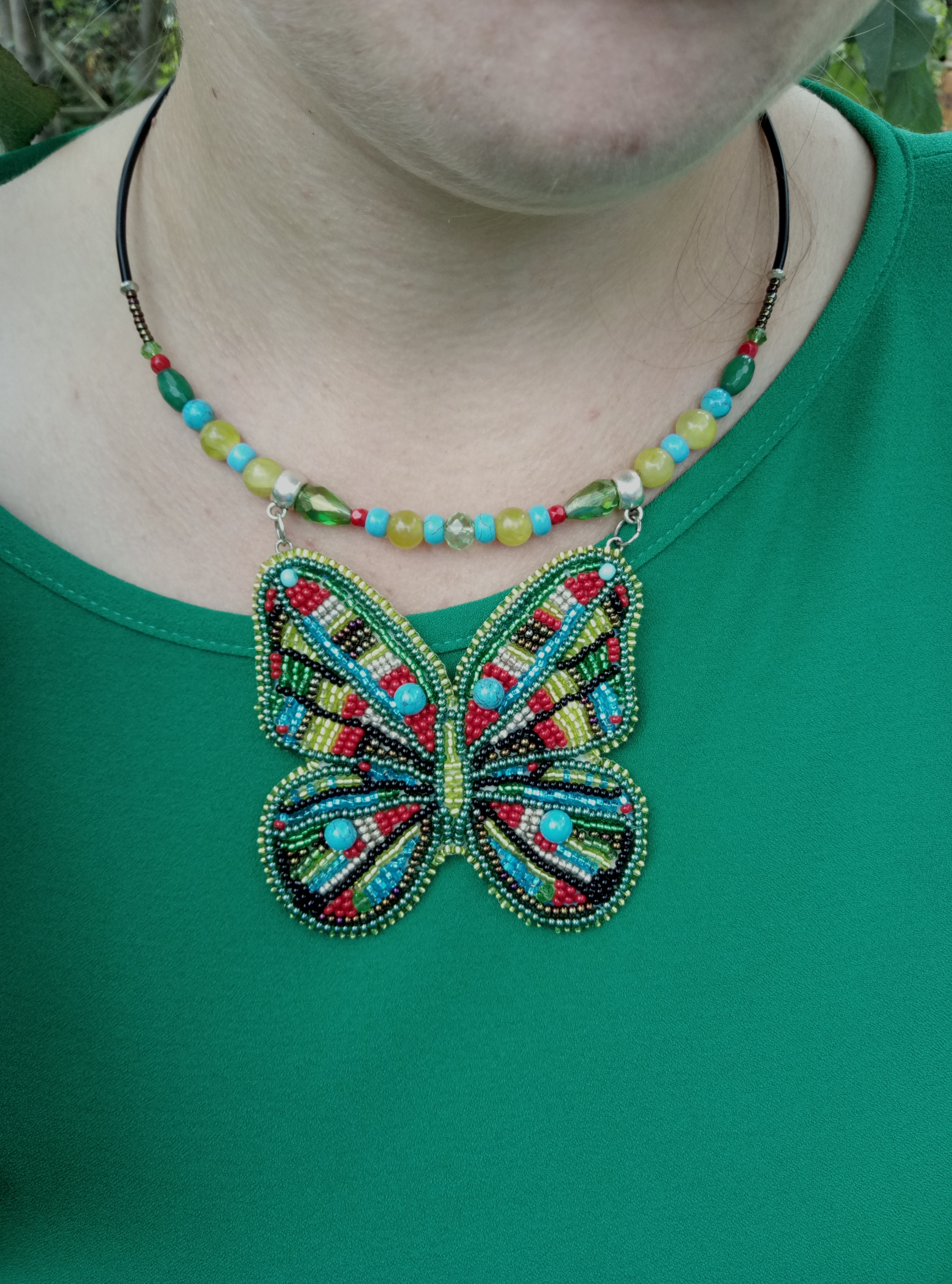 Колье с крупным кулоном "Стрекоза", расшитым бусинами и миксом Тохо.