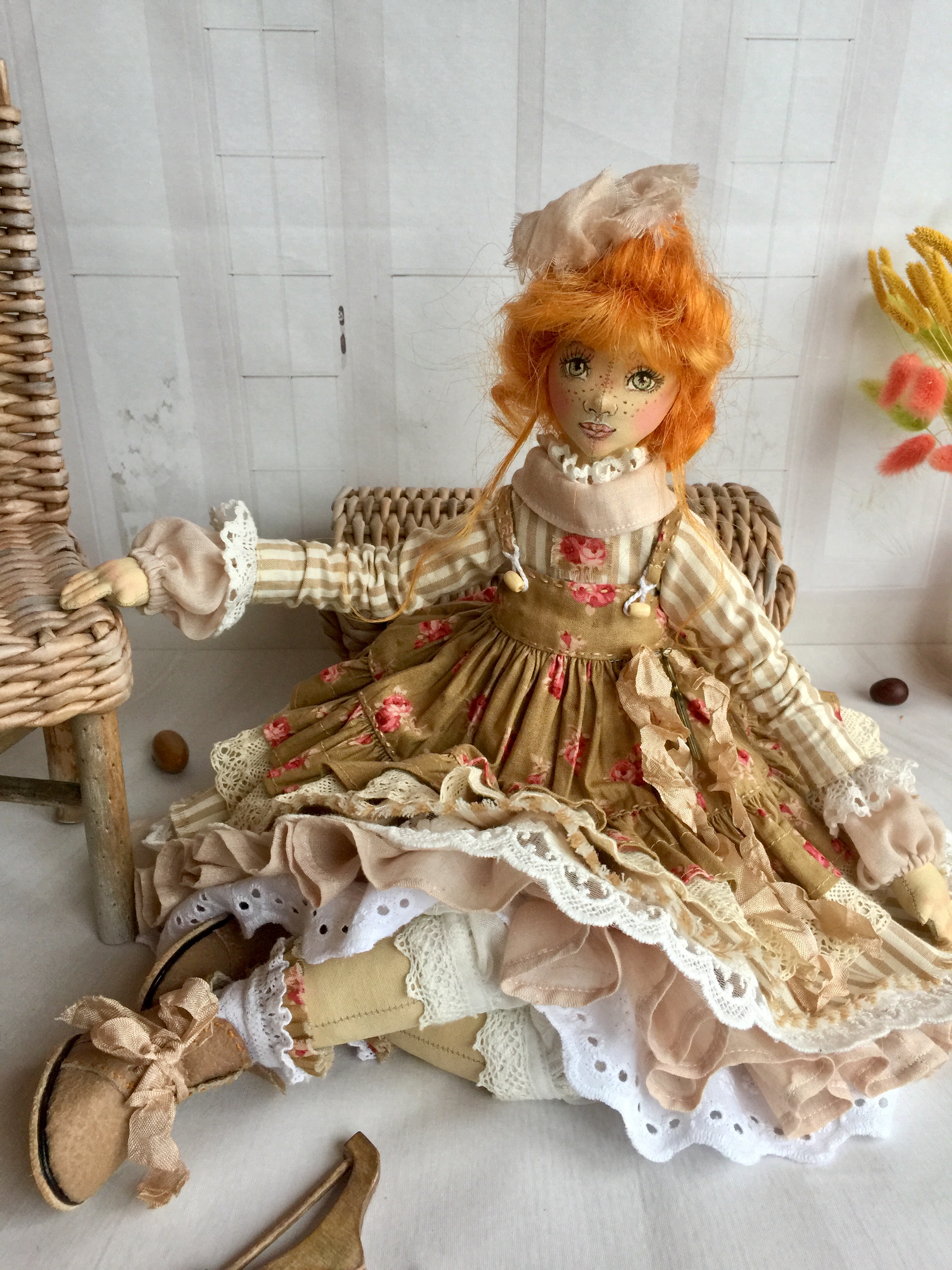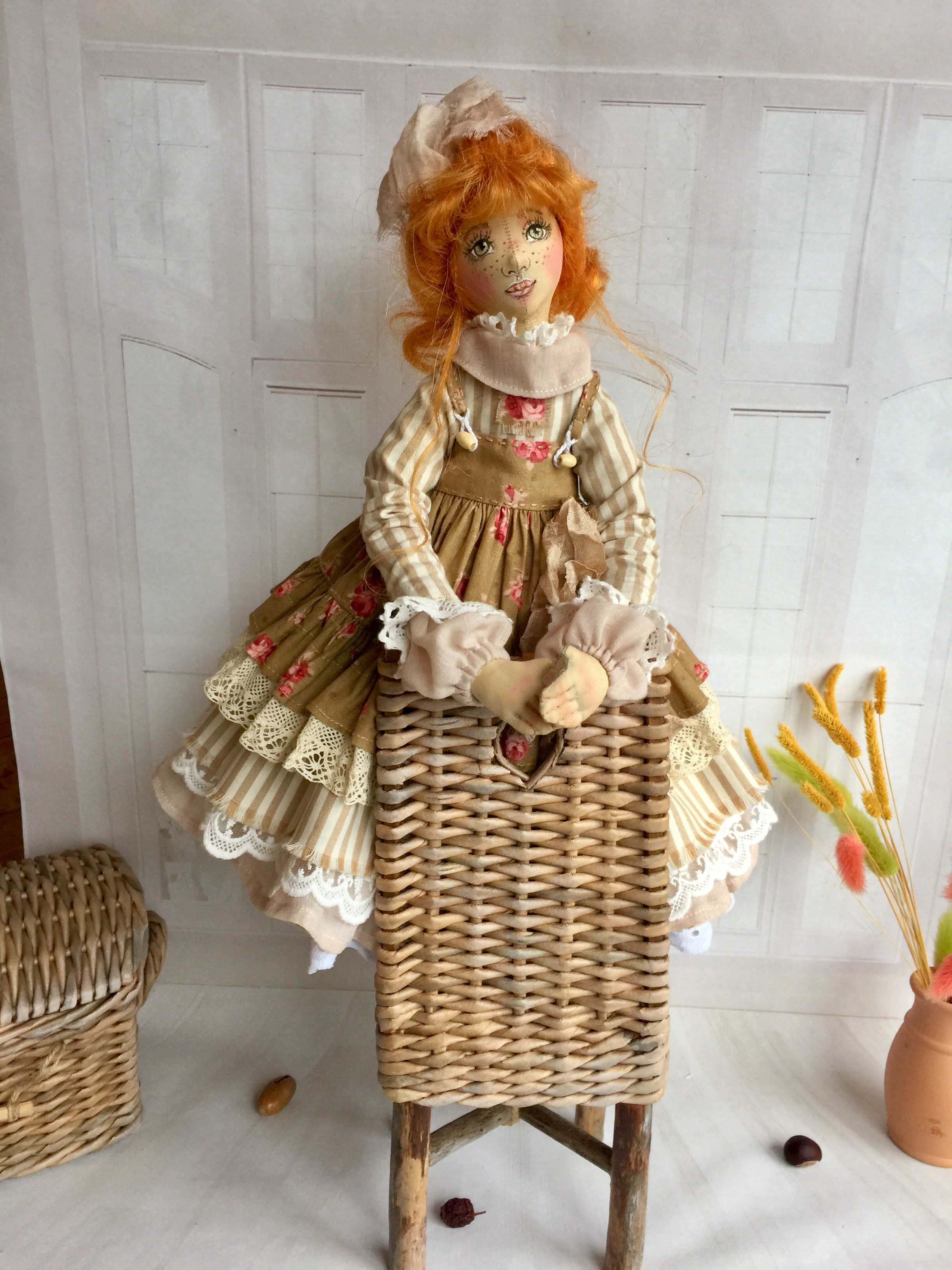 Текстильная интерьерная кукла, рост 50 см. Частично на проволочном каркасе, ножки свободно болтаются.