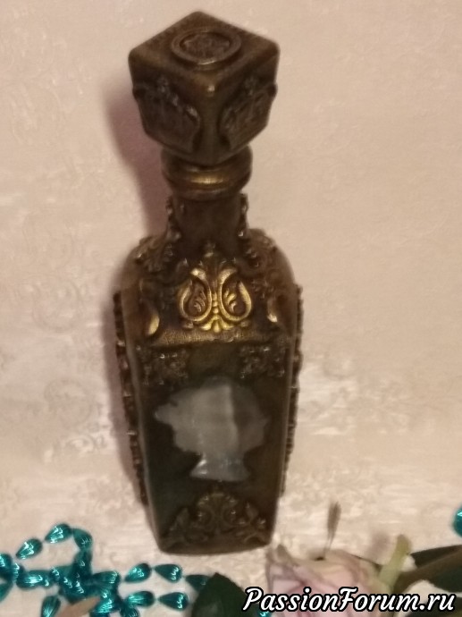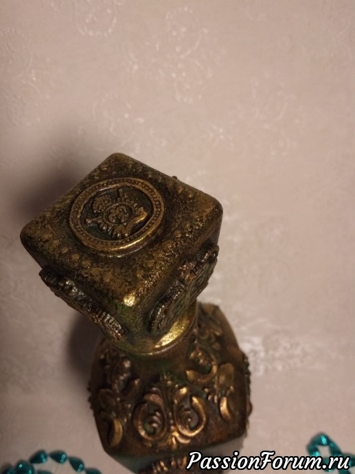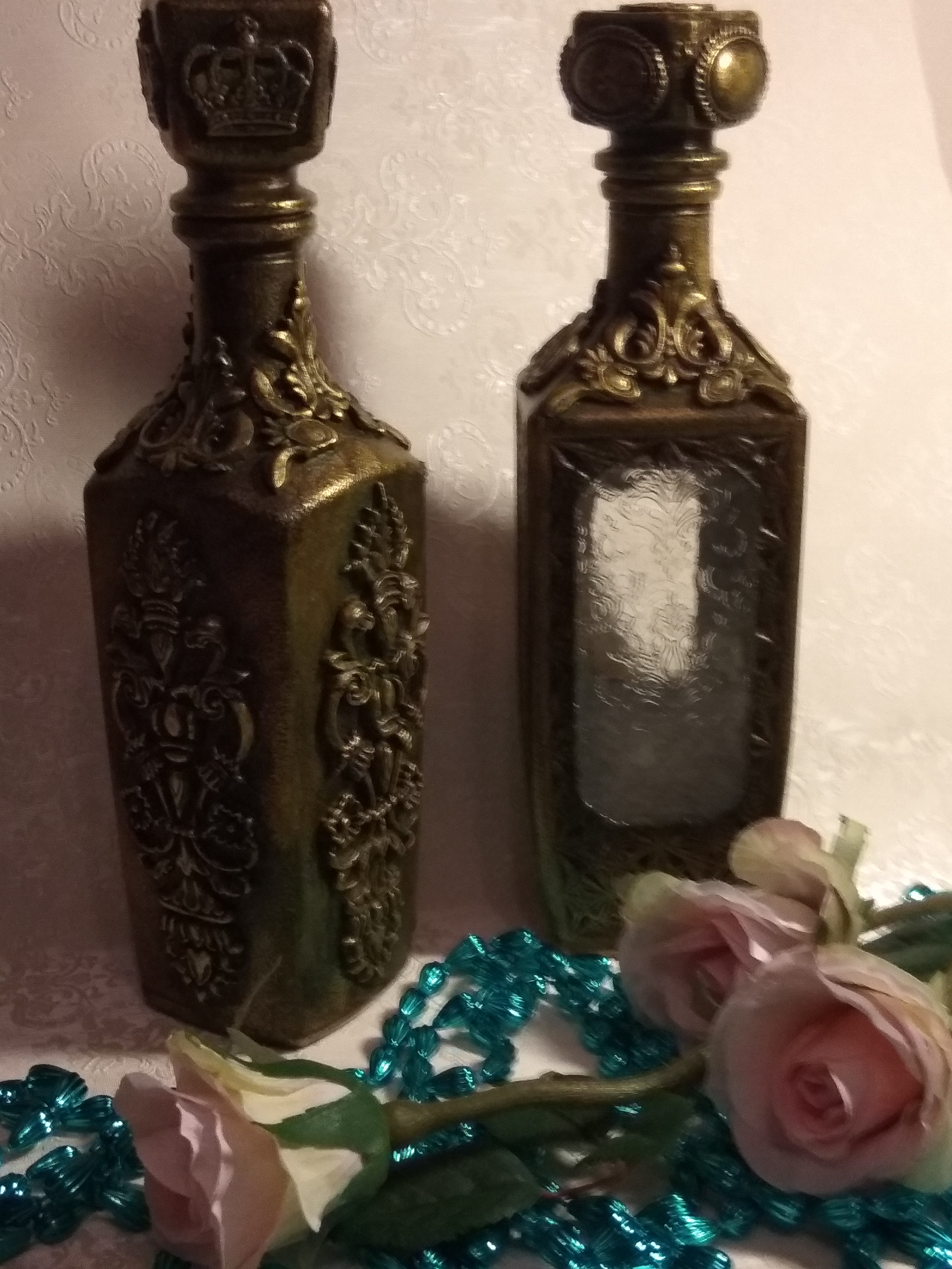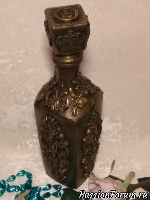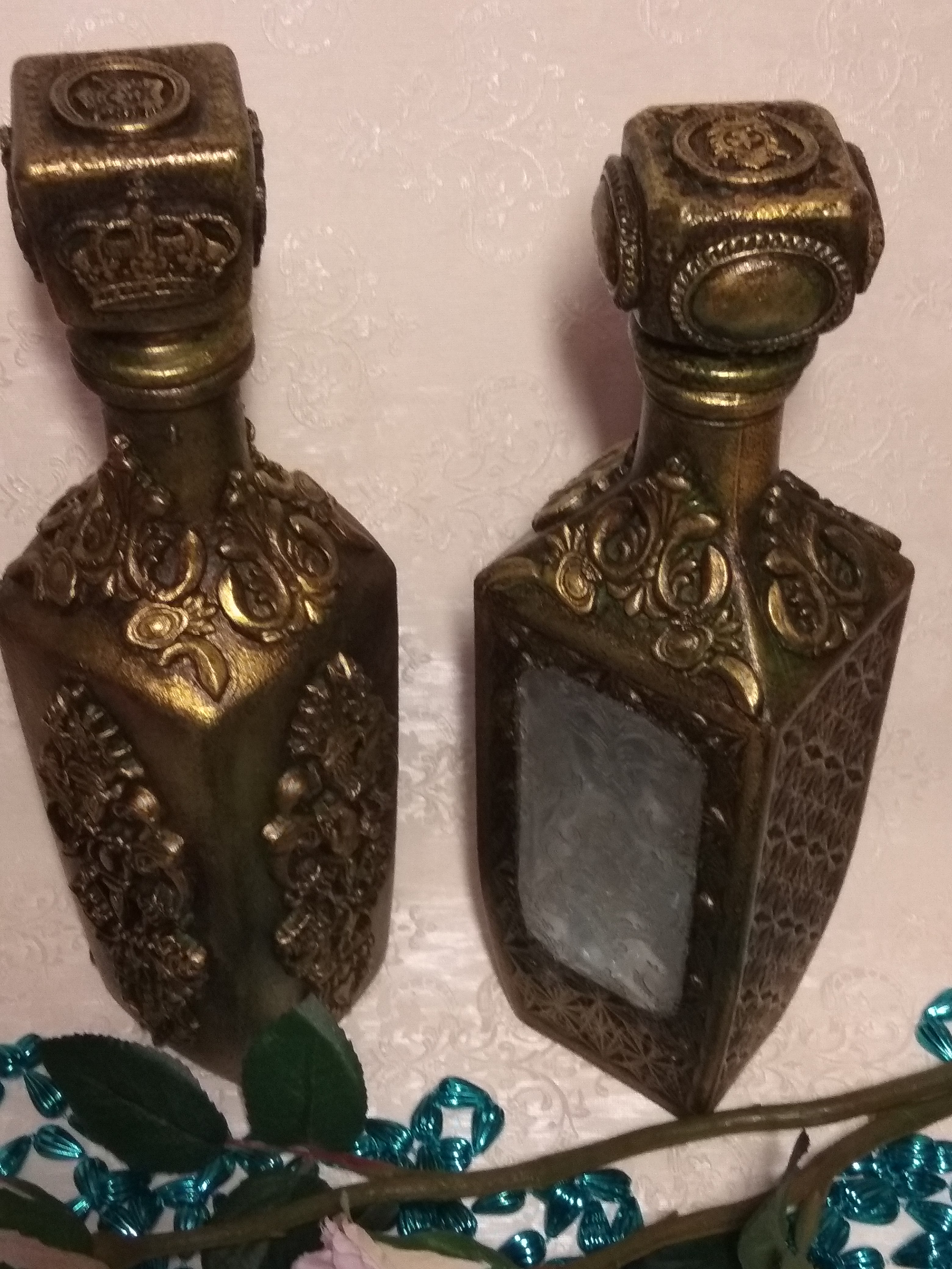 Один из штофов уже имел заводскую фактуру и места для творчества было не очень много,а другой был чистым и творческой мысли было где развернуться,что получилось теперь хочу представить вам. Штоф для женщины с фактурой Елизавета, мужской Екатерина. В работе использовались акриловый грунт,акриловые краски металлик Античное золото и оксид хрома для патины, битумный и золотой воски,прозрачная гель паста,молды,глина Дас. Фотографий много,хотела показать работы со всех сторон.