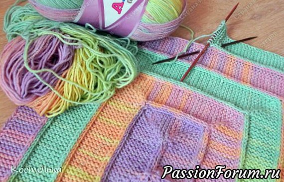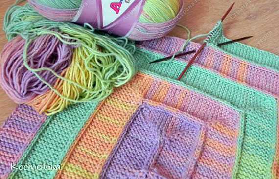 Плед вяжется платочной вязкой от двух разных клубков. Платочная вязка позволяет более быстро и точно ориентироваться по длине полосок, считая рубчики, которые образуются при вязании.