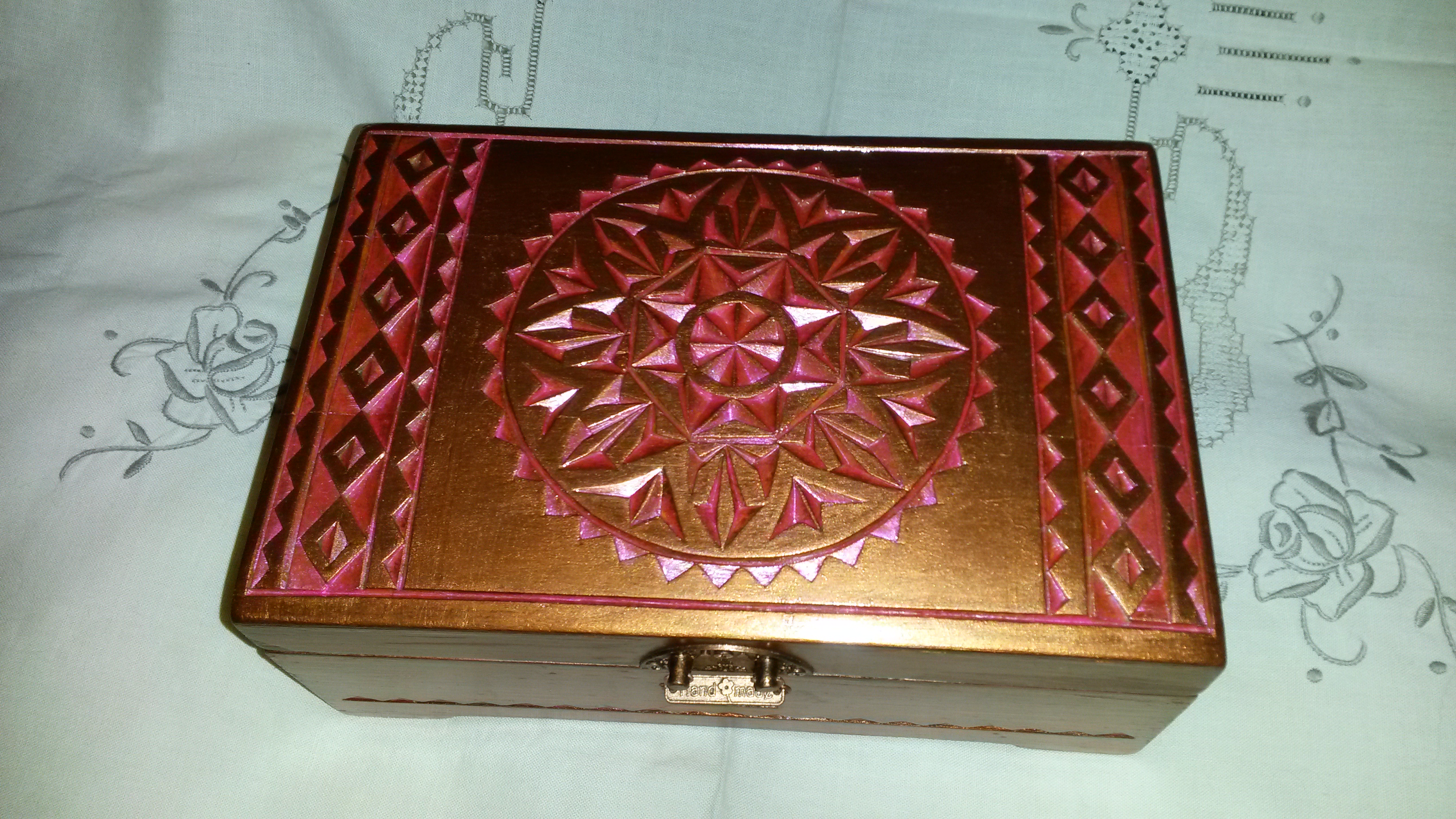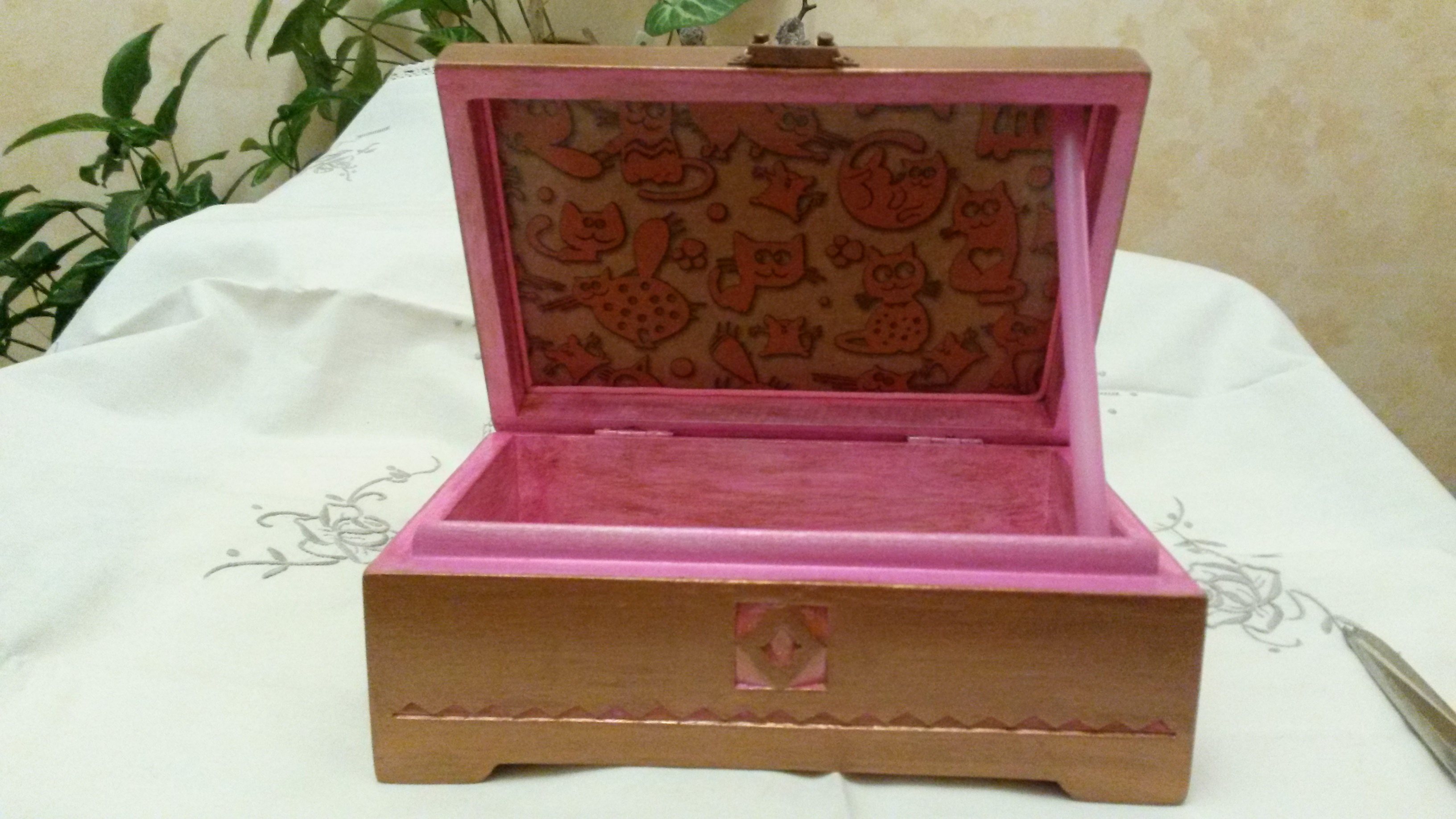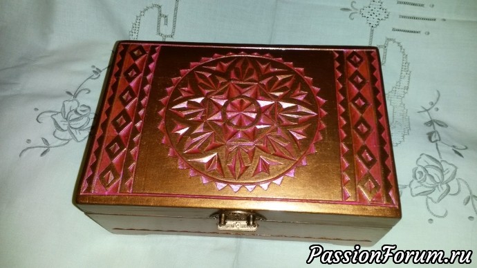 Забирала старую лампу, которую сын выкупил для меня. Я уже писала, что у сына хобби - он покупает и реставрирует старые советские светильники. Так вот, забирала в старом доме у дедушки. Спросила на всякий случай нет ли у них старых ненужных шкатулок. Дедушка вынес мне потрепанную жизнью резную шкатулку. И вот за сто рублей я стала ее обладательницей. Не хочется, чтобы в топике первой была некрасивая картинка. Поэтому сначала покажу окончательный результат, а потом этапы работы) Вот что получилось