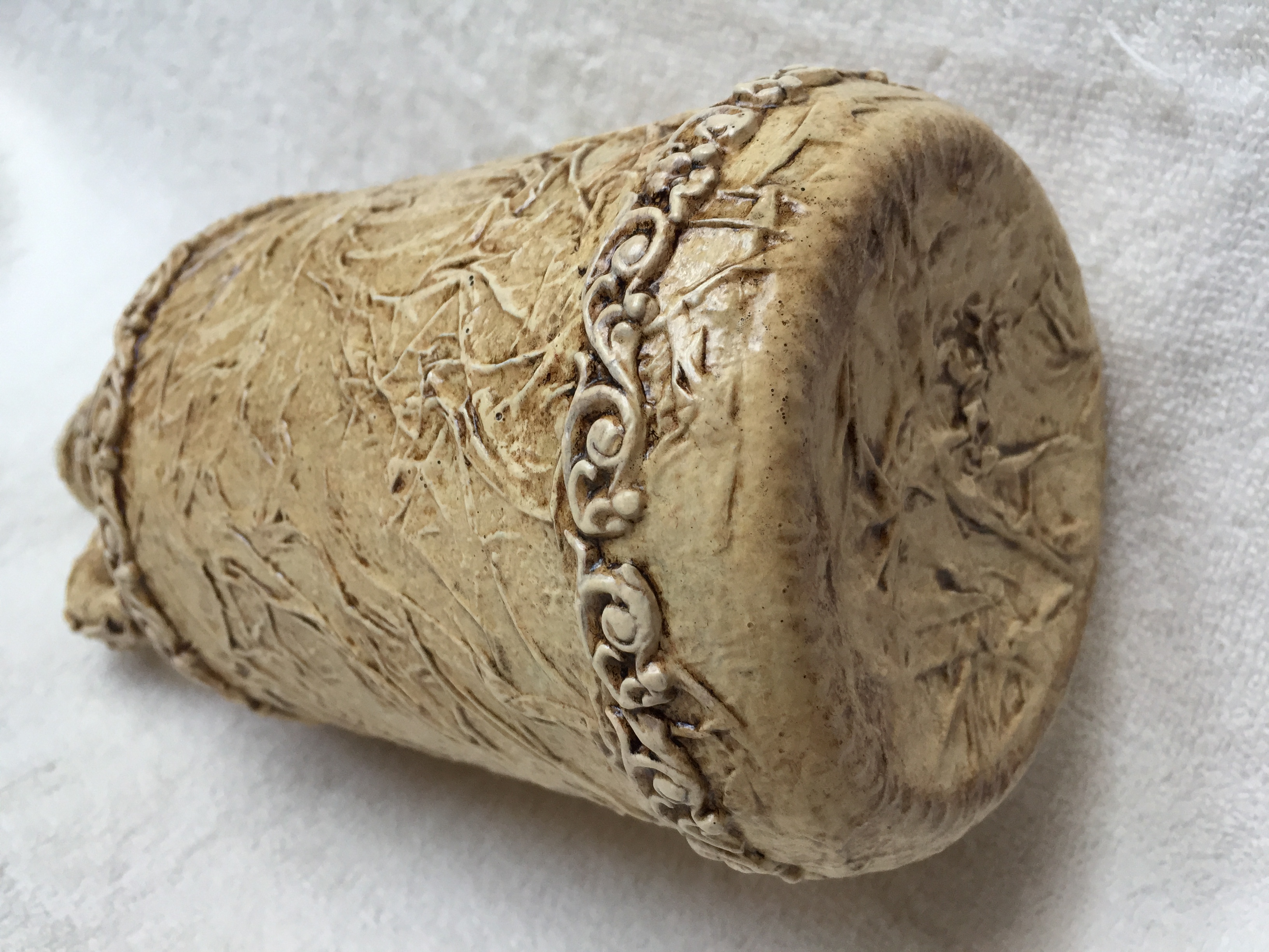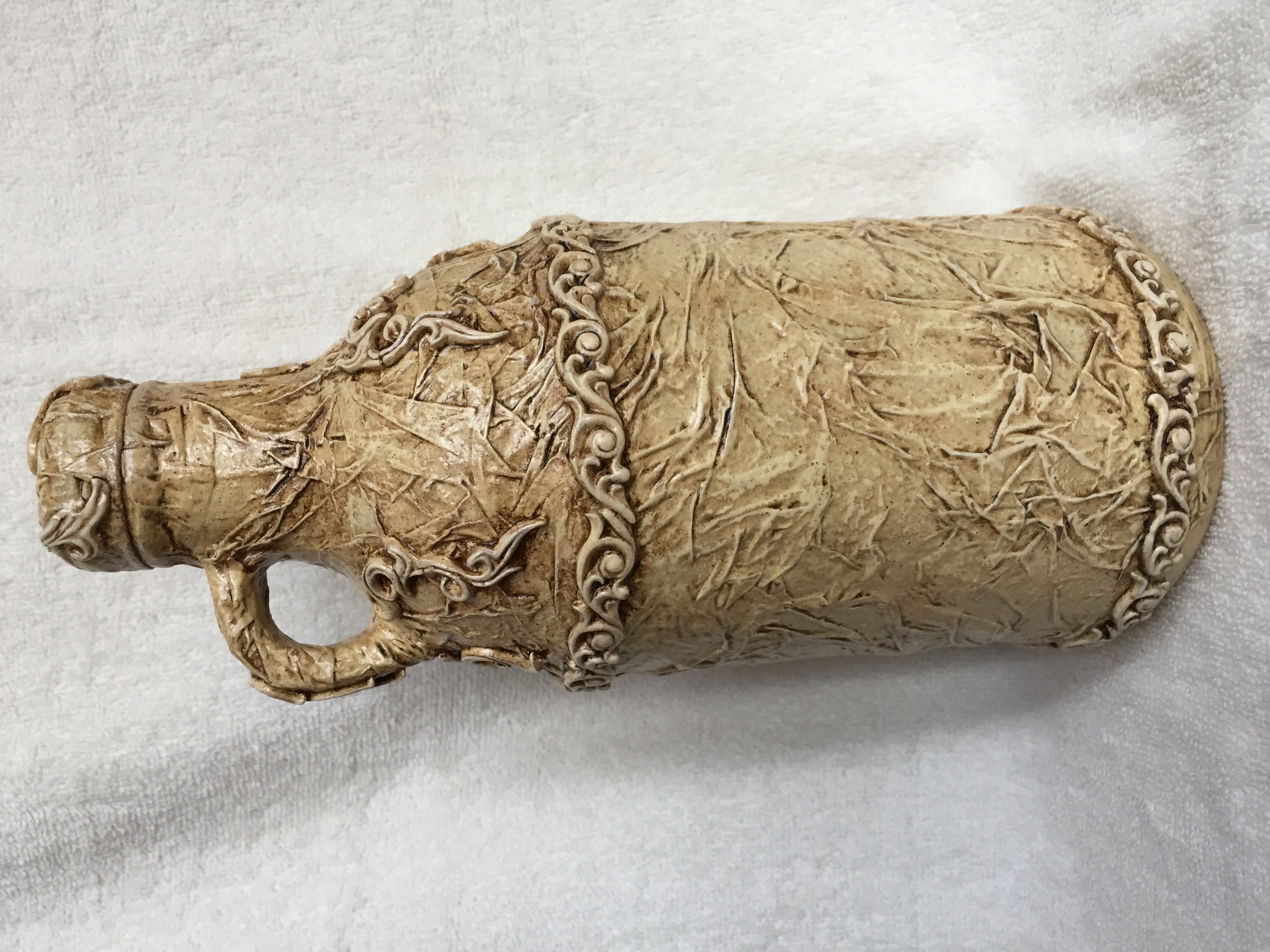 Но сделала вроде без напряга. Единственное, слепки из глины ДАС сделала рановато – сжатое бумажное полотенце на бутылке не успело высохнуть. А сырую глину на сырую основу клеить не захотела. Ну, а когда бутылка высохла, слепки (ясен пень) – тоже. Не надо было спешить с лепкой, или положить их на влажное полотенце, прикрыв сверху. А то, внимая возмущению жабы, пришлось уже сухие класть на мокрую салфетку, пока малость не размягчатся. Но всё равно немного поломались. Выбрасывать не стала, и новые вылеплять – тоже. А вообще-то старенькая бутылка и должна быть потрескавшаяся от времени. Приспособила все!!!