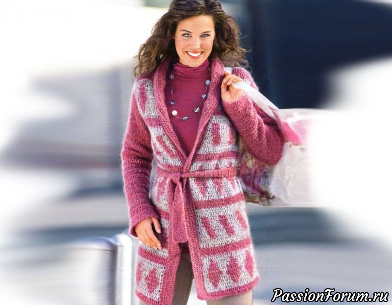 Сборка:выполнить плечевые швы: втачать рукава, выполнить боковые швы и швы рукавов. Для планки и воротника связать розовой нитью по краям полочек по 84 ст. с/н. по скосам выреза по 33 ст. с/н и по вырезу горловины спинки 36 ст. с/н = 270 ст. с/н. Затем вязать основным узором укороченными рядами воротник, для этого обвязать средние 46 п., как описано, затем с обеих сторон ввести в работу в каждом ряду 8 раз попеременно 3 и 4 ст. с/н больше, в следующем ряду 5 ст. с/н. Через 3 р. от начала воротника равномерно прибавить 10 п. = 122 п. Затем связать на всех петлях включая планки, 3 р. основным узором. Для пояса связать розовой нитью цепочку из 8 возд. п. + 3 возд. п. подъёма, связать 140 см основным узором и работу закончить.
