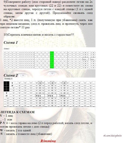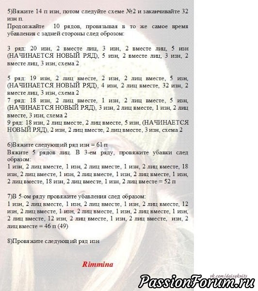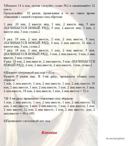 Если при таком типе убавления (в каждом 2-ом р.) шапочка получиться очень «мелкой», то можно делать убавки в каждом 4-ом или с чередованием 2-й, 4-й р, но так чтобы вверху все равно несколько рядов петли убавлялись в каждом ряду. Это обеспечит шапочке сверху окат, а не некрасиво выпирающий треугольную макушку.