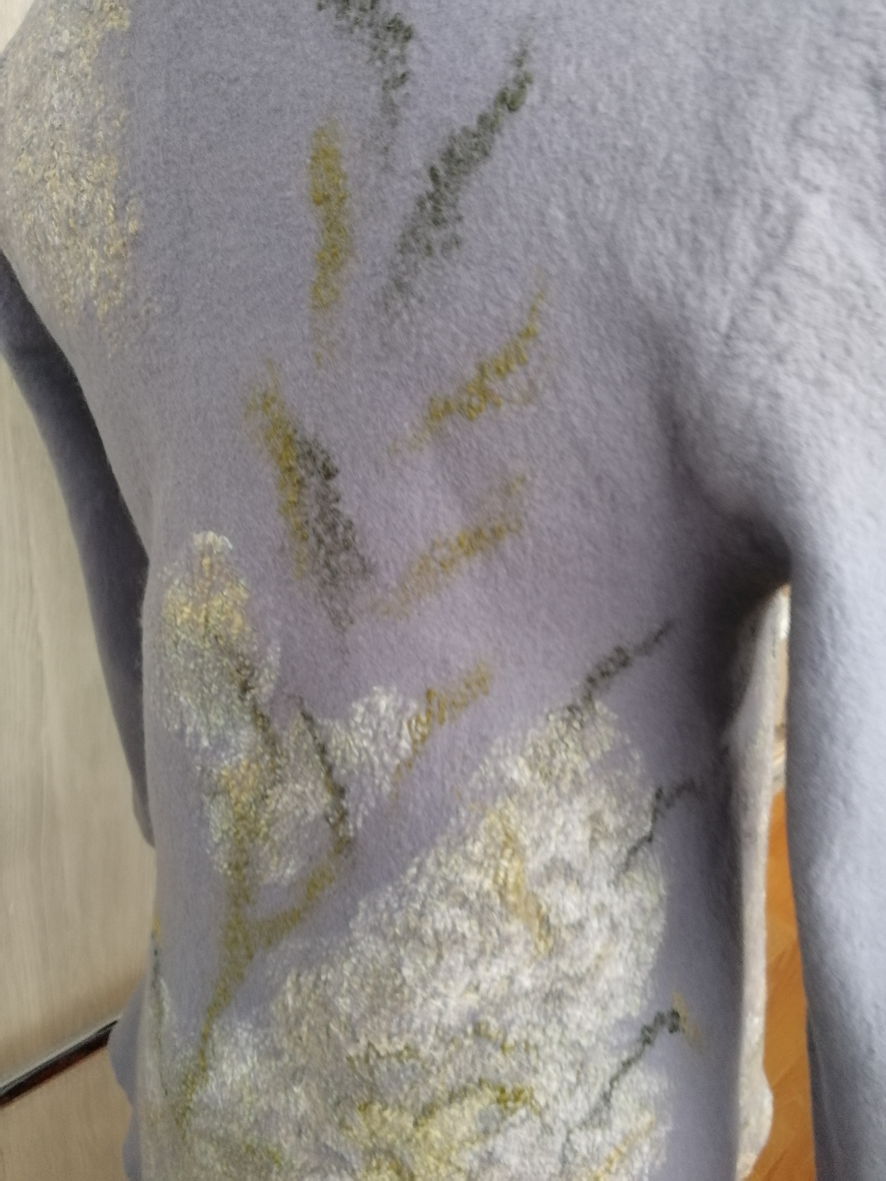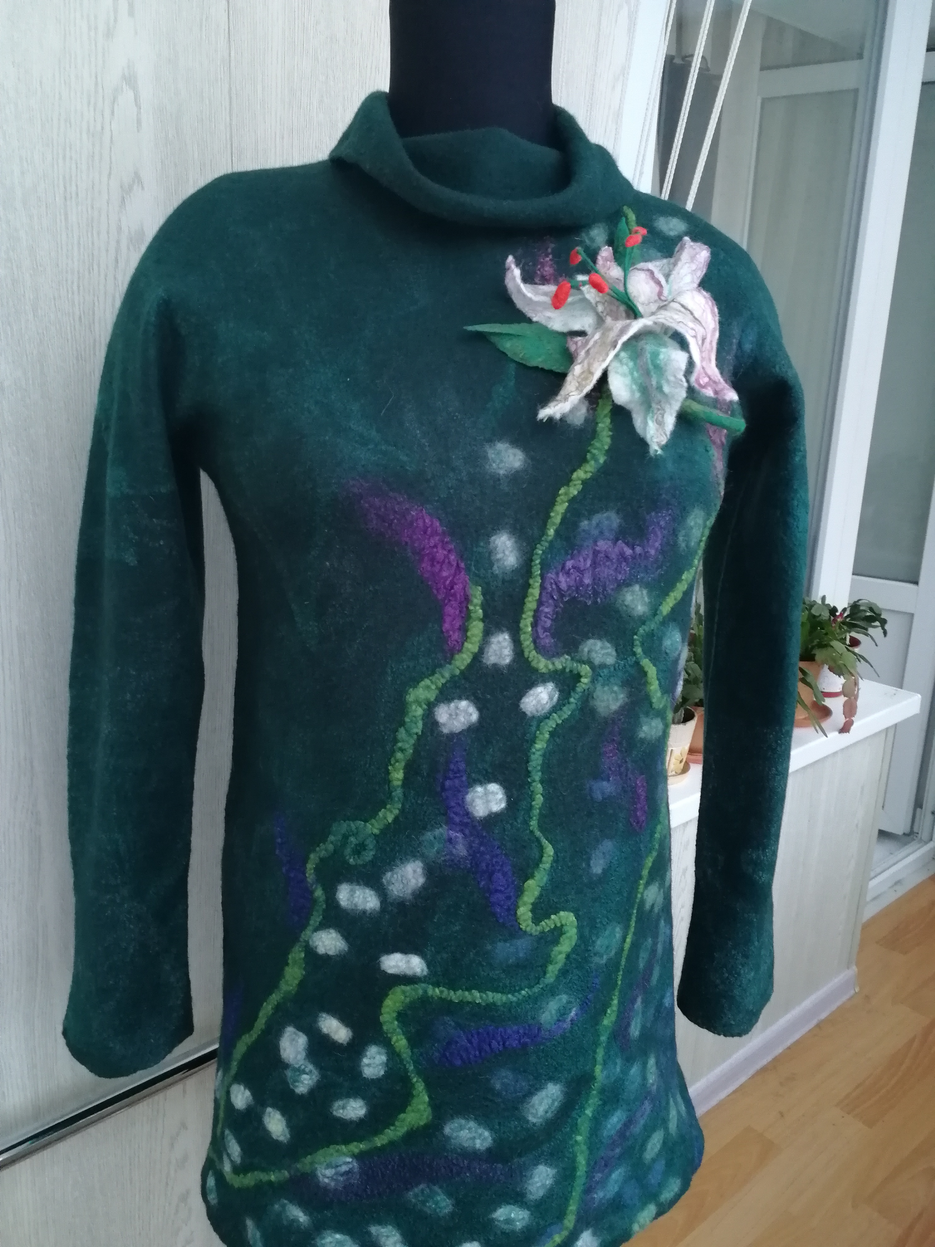 3. Зеленый джемпер валяла на заказ. Получился изумительный тонкий войлок. Снизу шелк, сверху- шелковые квадраты, волокна и пряжа ровница. Лилия отдельно- в виде броши.