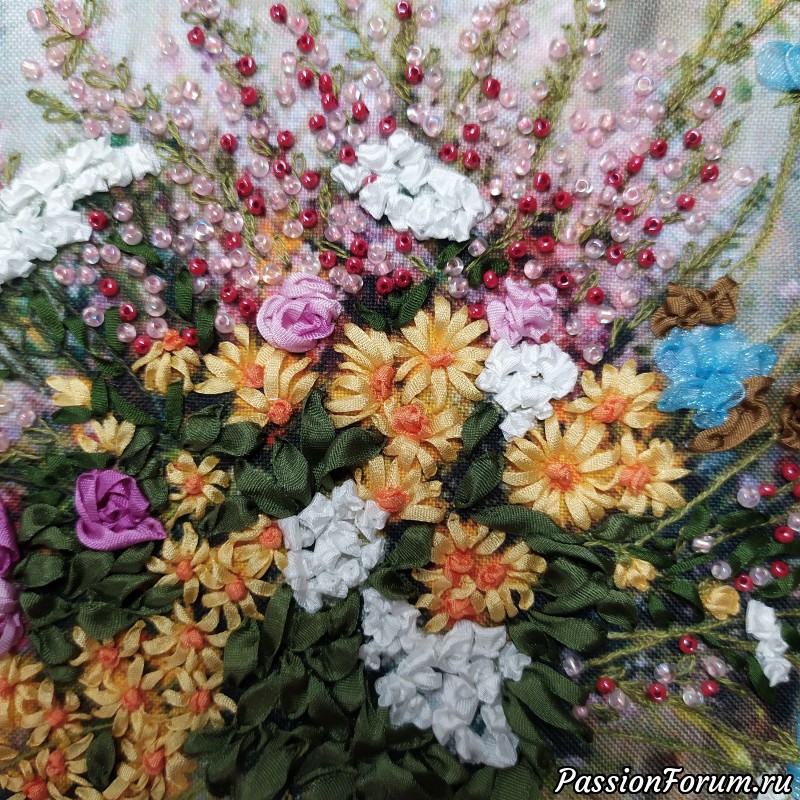 Мелкие цветочки мне очень нравятся! Как то пробовала широкими лентами вышивать — не понравился мне результат. Может, сюжет был неподходящий или ленты не те.