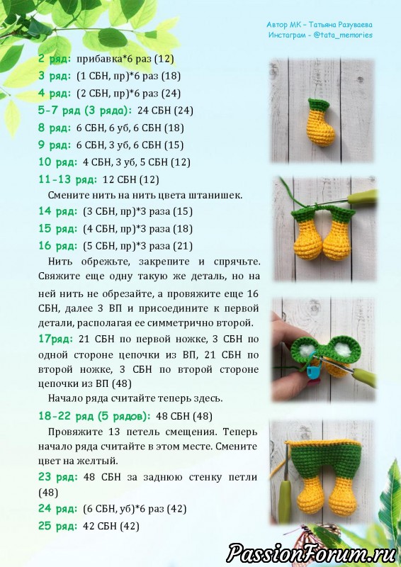 Для создания льва автор использовала крючок №2 и пряжу YarnArt Jeans желтого, белого, терракотового, коричневого и зеленого или другого цвета для штанишек. Высота готовой вязаной игрушки около 15 см.