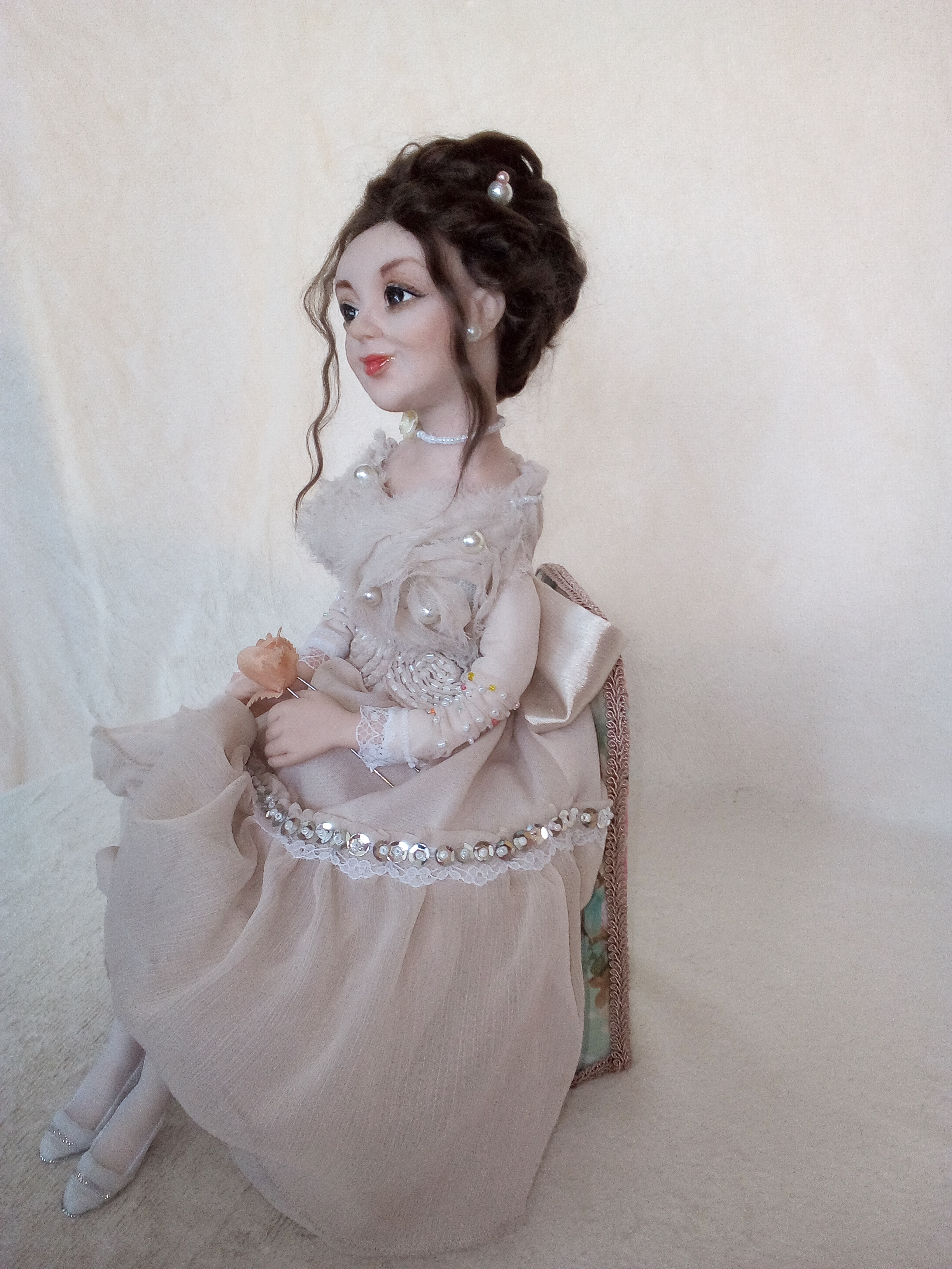 Натали. Кукла в смешанной технике. Полимер запекаемый+ текстиль. В руках и ногах проволочный каркас. Волосы натуральная козочка. Платье шифон. Туфельки обшиты на бисером от пятки до носика по подошве около 4 см. длиной, не снимаются. Одежда не съёмная. Ростик примерно 40 см.