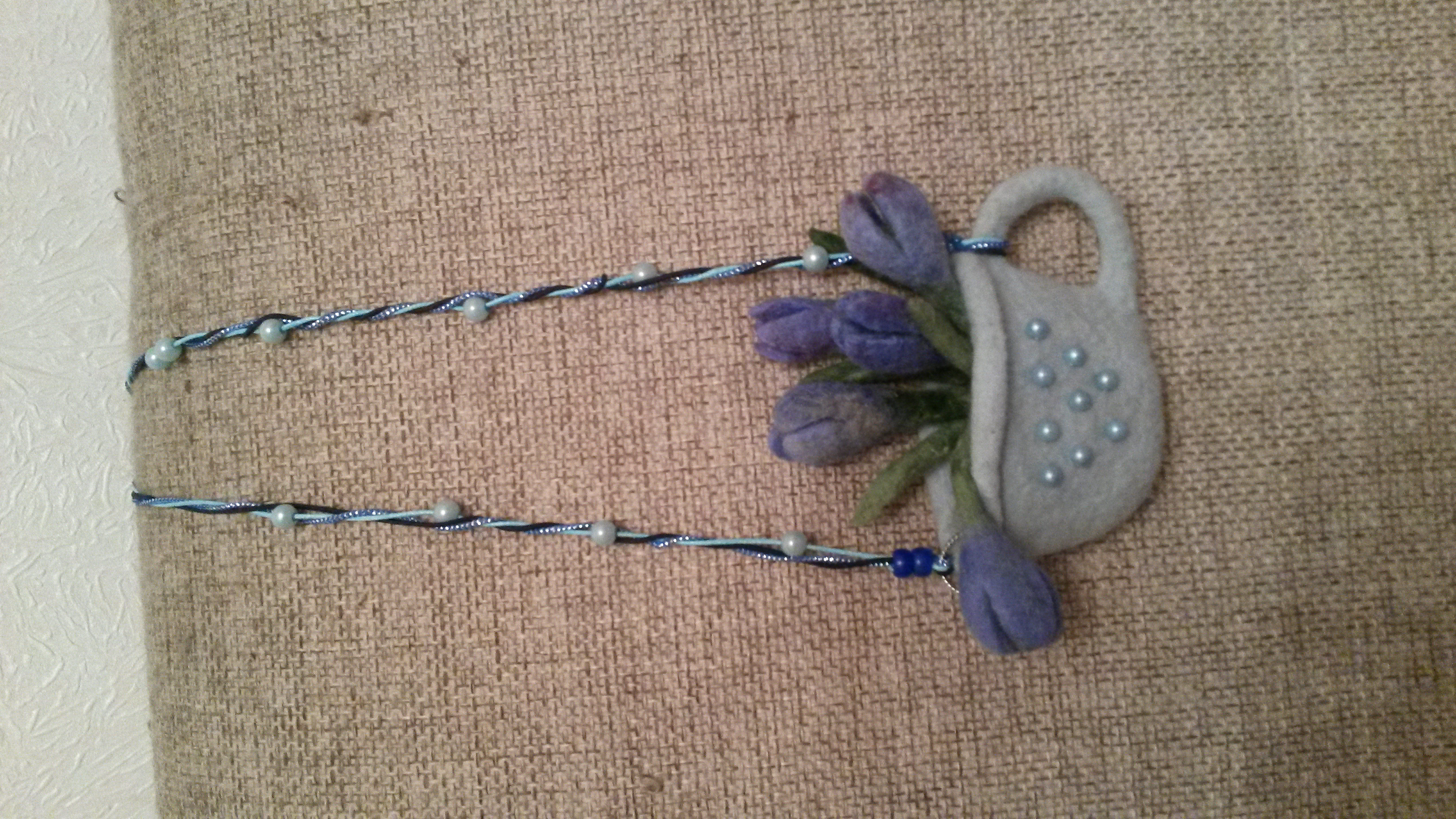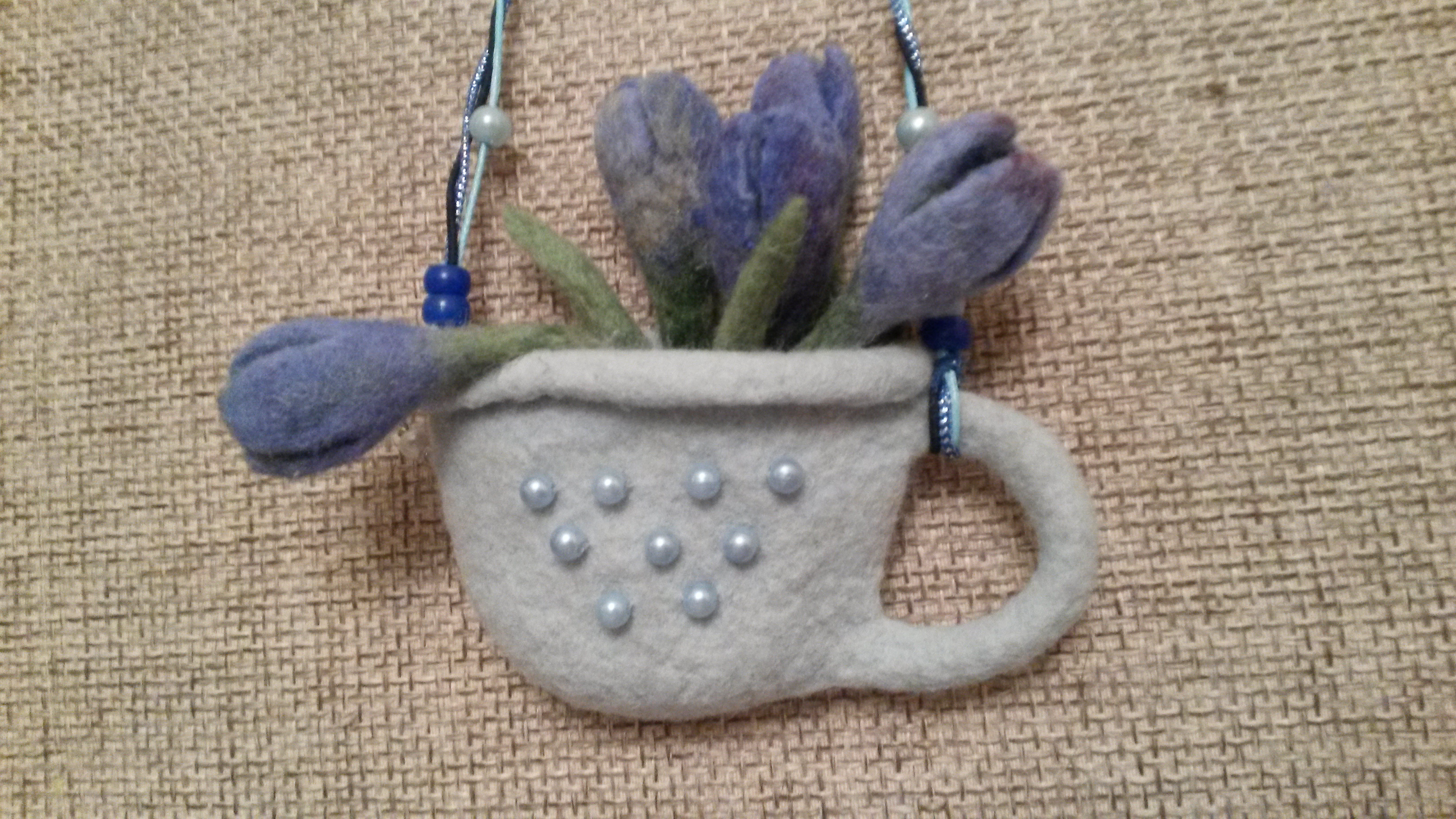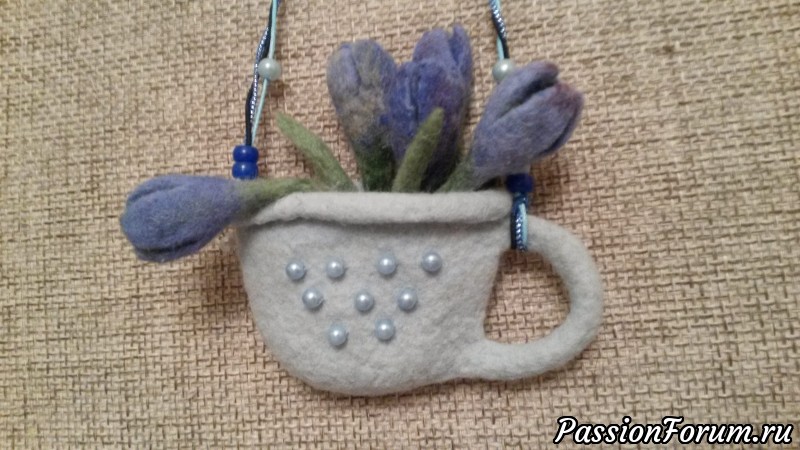 Подарила мне моя соседка по комнате в Тбилиси Люда чудесную чашку с крокусами (мокрое валяние) Я хотела сделать с чашкой объемную картину - окно, штора и чашка с крокусами на подоконнике. Даже рамки попримеряла) Но потом решила украсить себя любимую и оформила чашку как подвеску) Уже выгуляла и сорвала аплодисменты в редакции) Мой творческий коллектив оценил)
