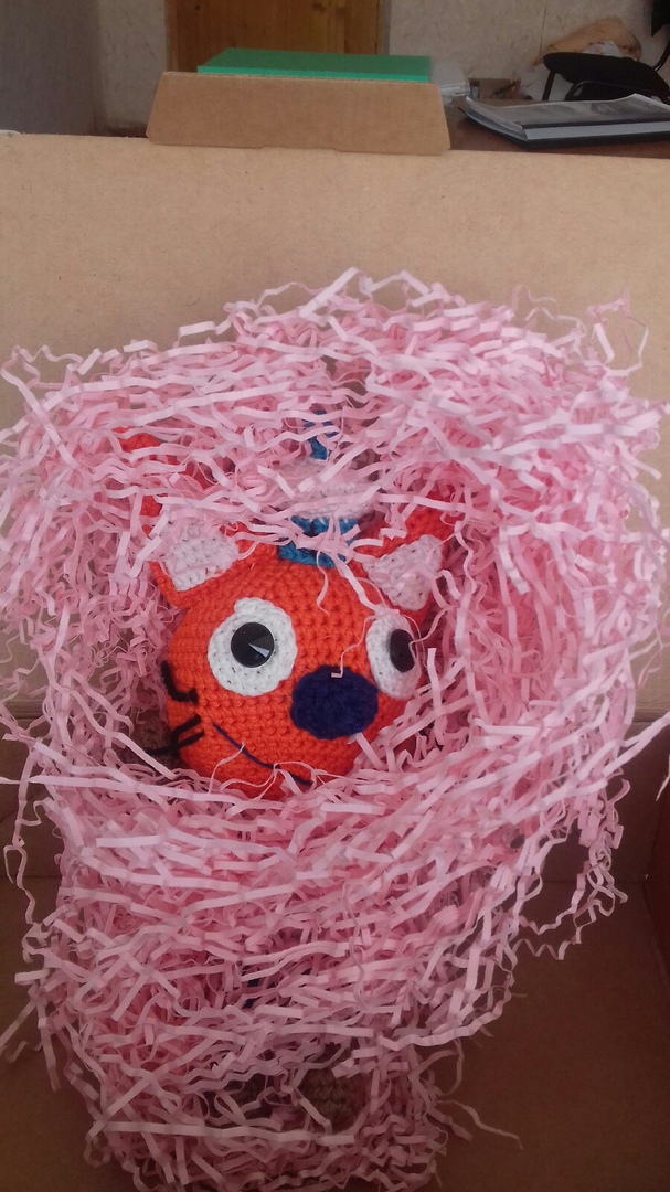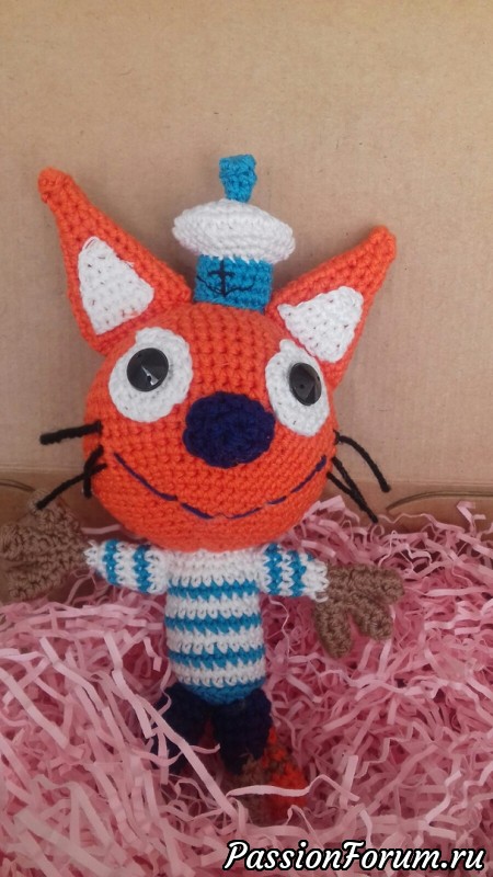 Моя драгоценная внучка Виктория 1,5 года от роду без ума от мультика "Три кота". Знаю, что многим ребятишкам он нравится. Для нее скупаются герои в виде кружек, маек, резиновых игрушек и т.д. А вот с с Коржиком нам не везет. И, о радость, из трех моих заказиков был выбран именно Коржик!
