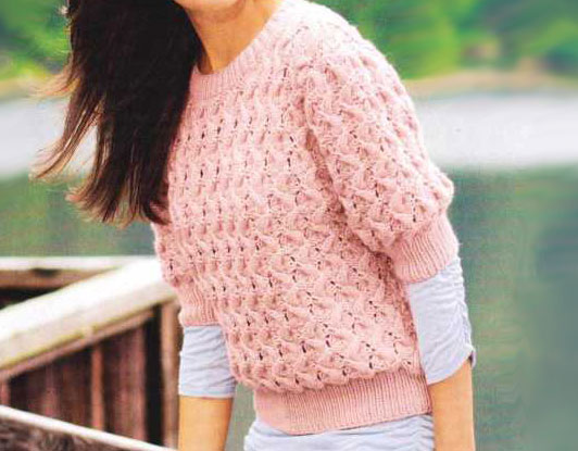 Для изготовления пуловера из ажурного узора Вам потребуется: 550 (600) 600 г розовой пряжи Cashmerino Aran (55% мериносовой шерсти, 33% микроволокна, 12% кашемира, 90 м/50 г); прямые спицы № 4.5 и № 5; круговые спицы № 4,5.