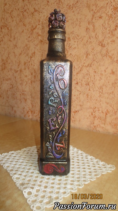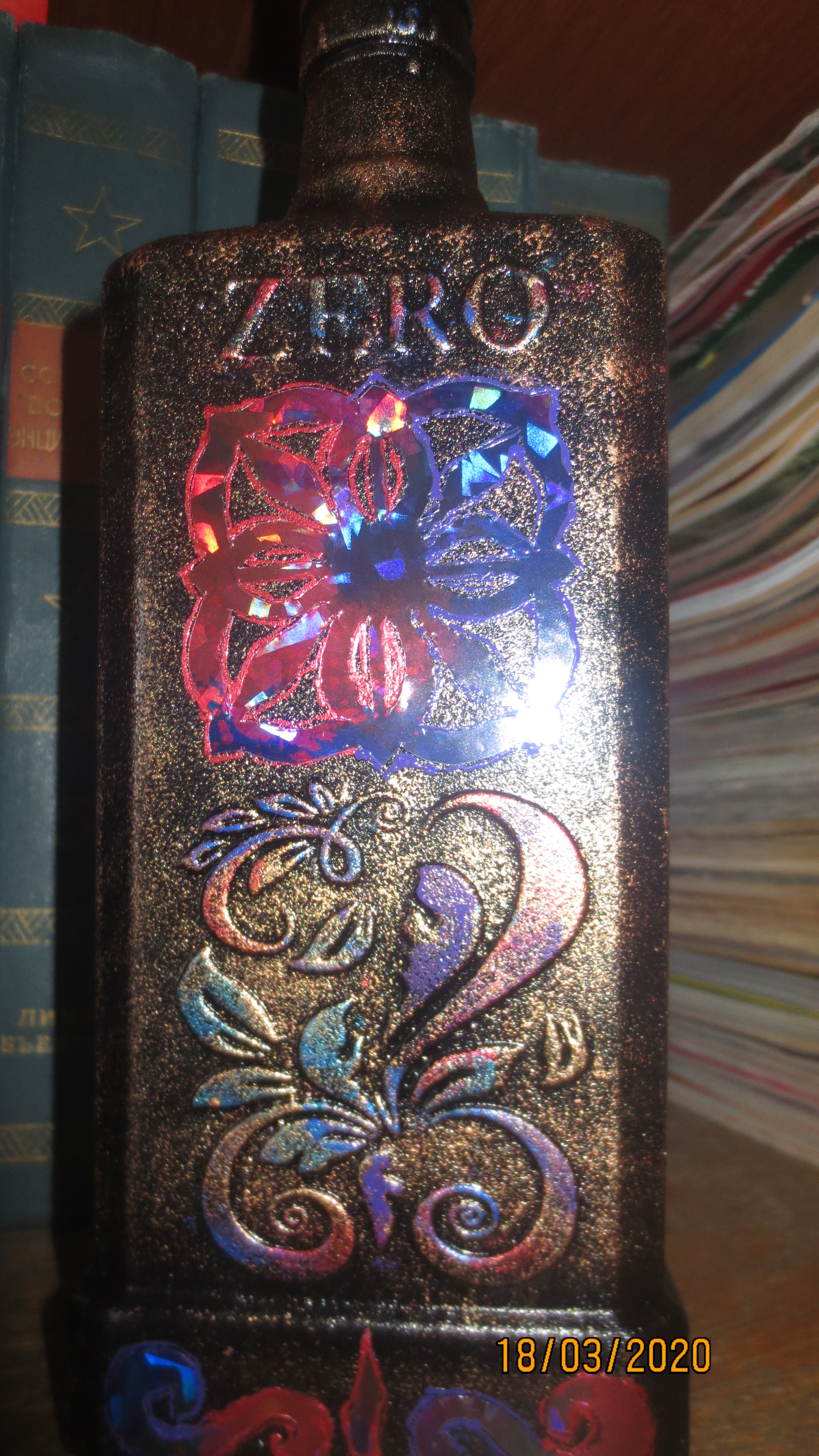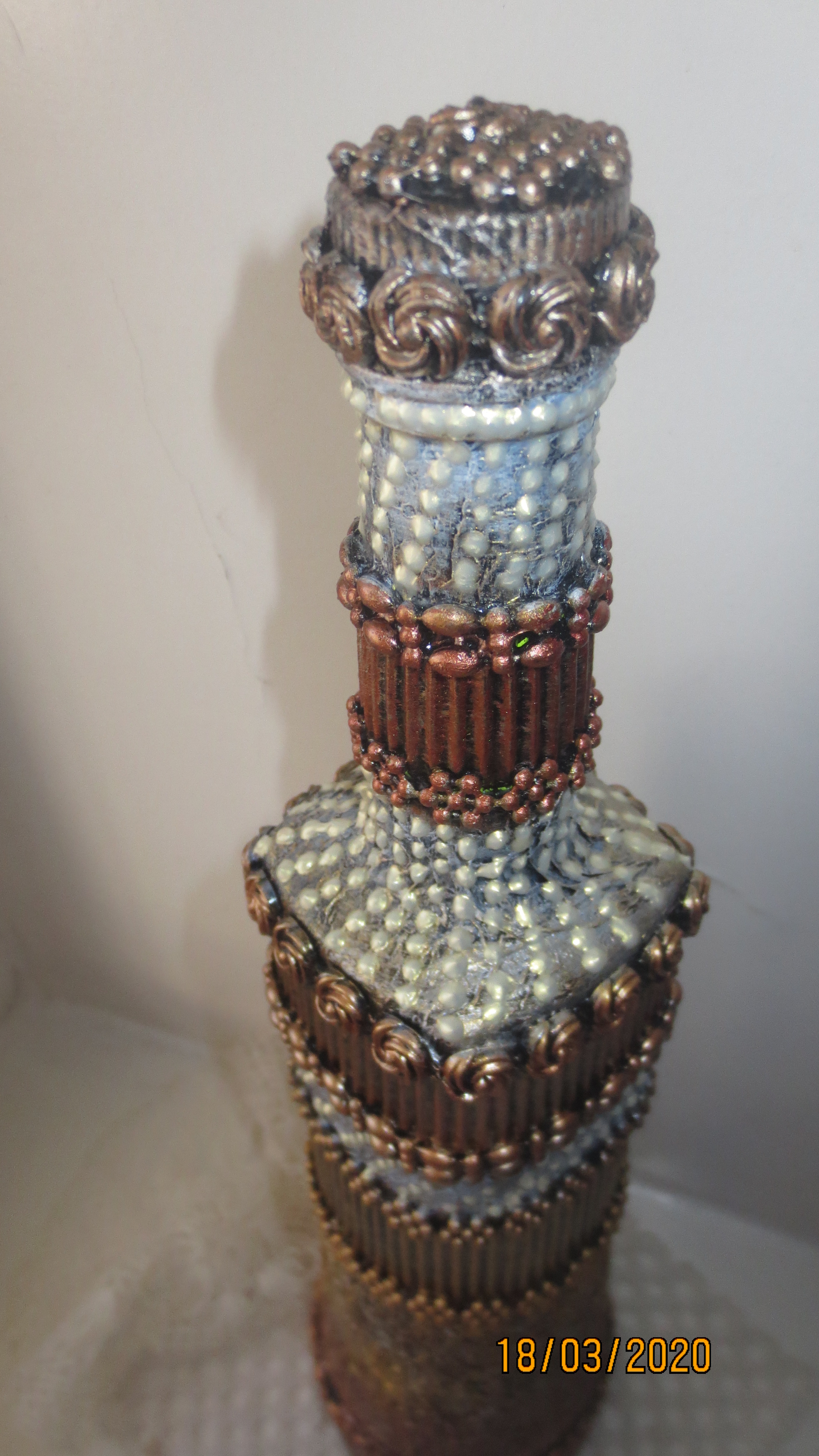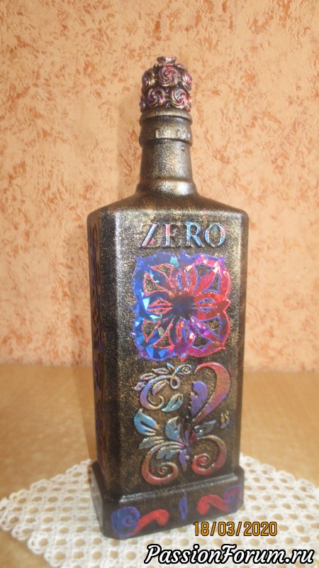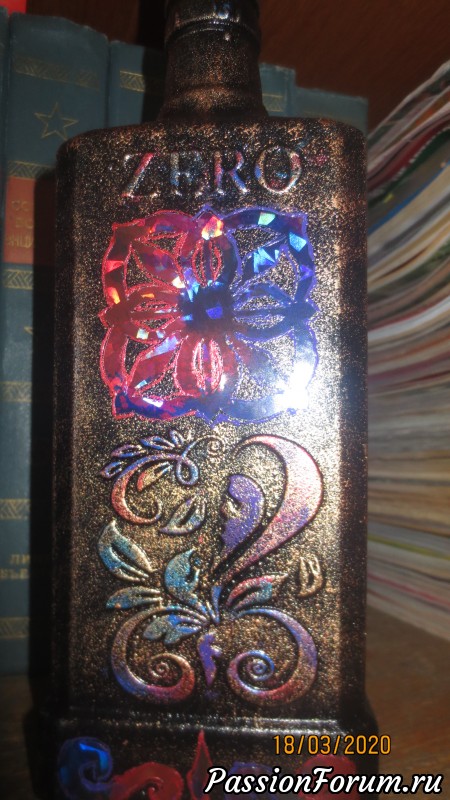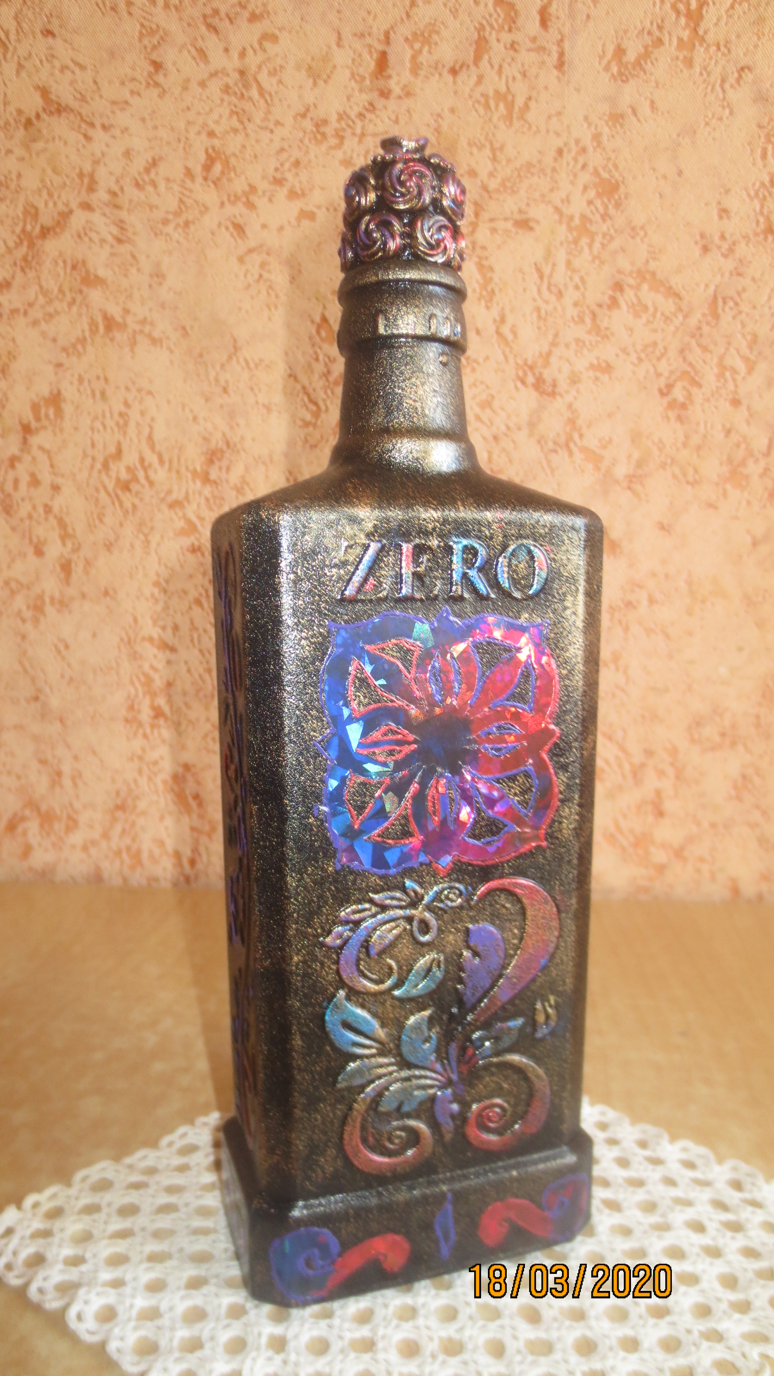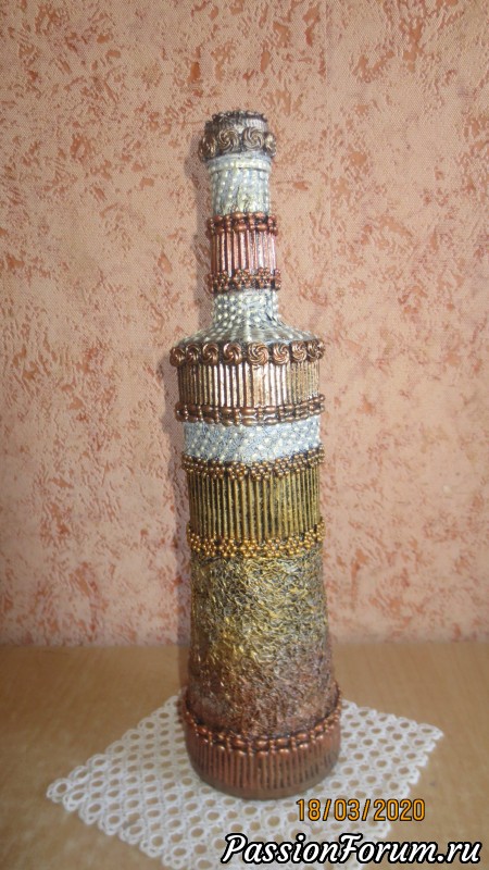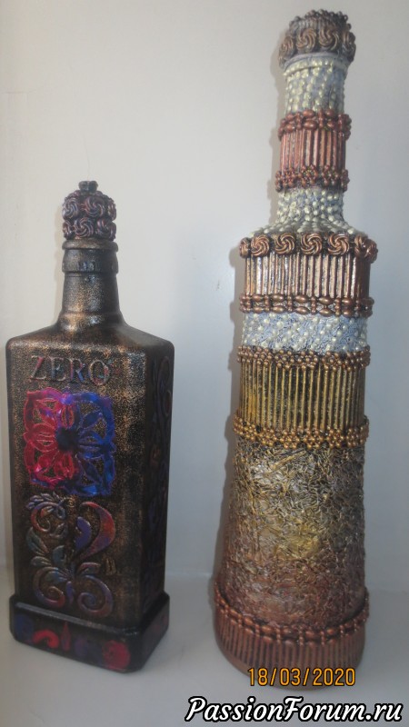 С фольгой классно получилось, но у второй бутылочки немного перебор с текстурой, хотя гофра выгодно разделила бутылочку на зоны - и по цвету и по текстуре — в целом получилось не плохо… Понимаю, Надежда, каждый раз придумывать новое сложно, особенно когда хочется что-то нового, потому ненавязчивый совет — попробуйте ещё «поиграть» с этими же текстурами — получите интересную серию и, уверена, найдете новые интересные решения!