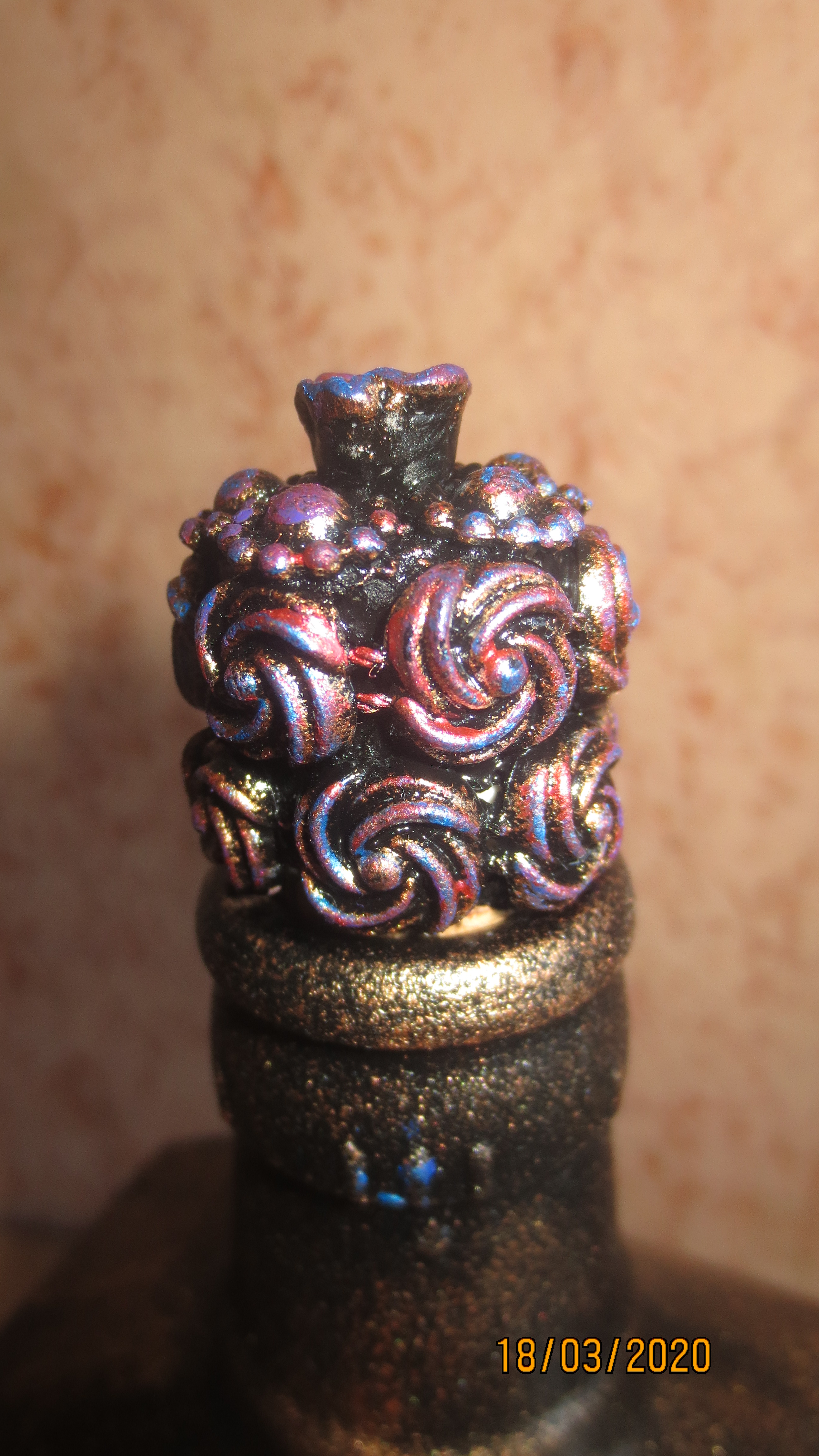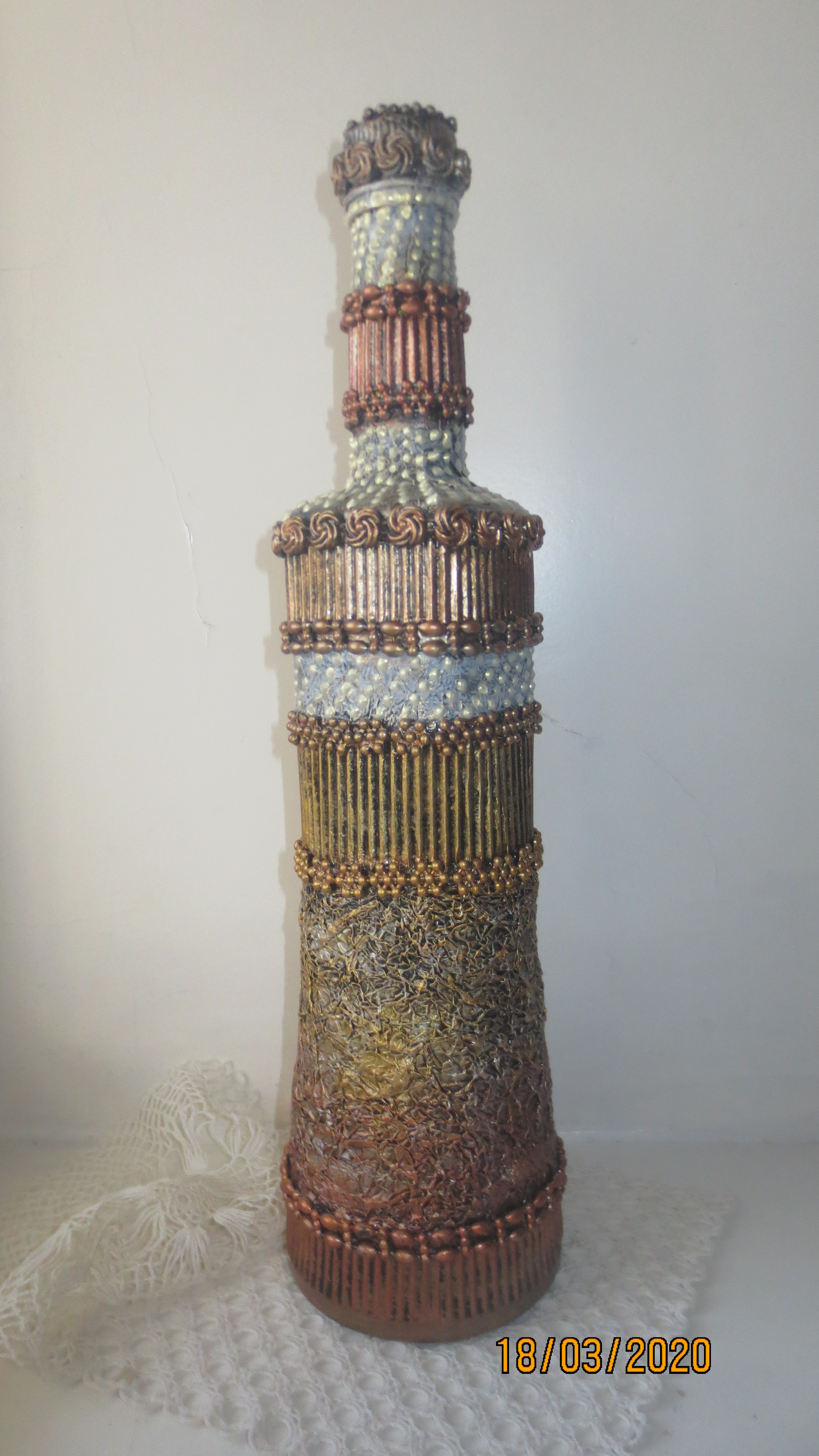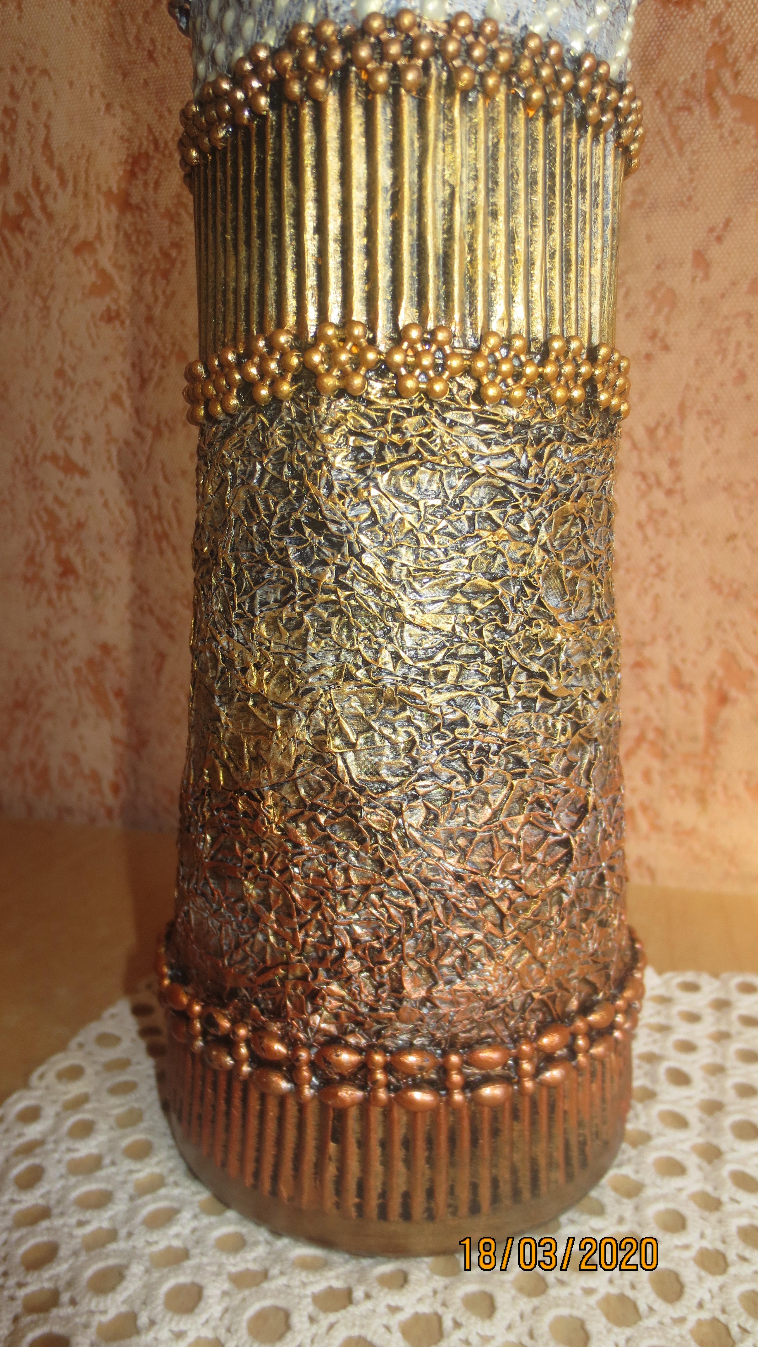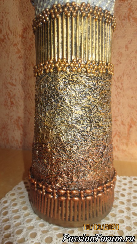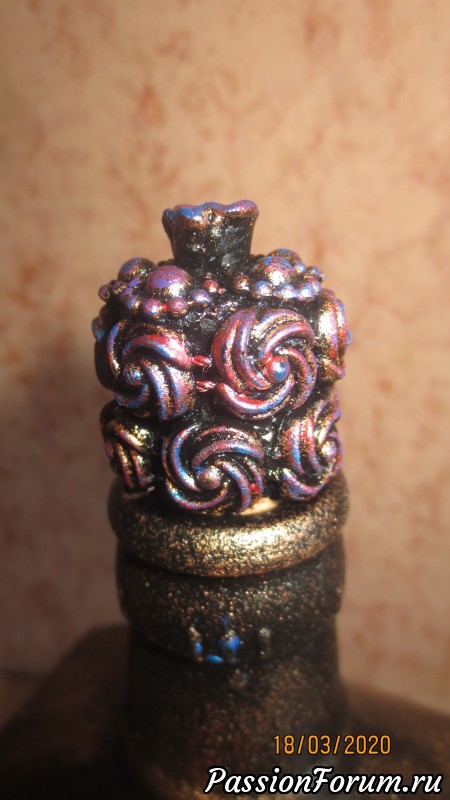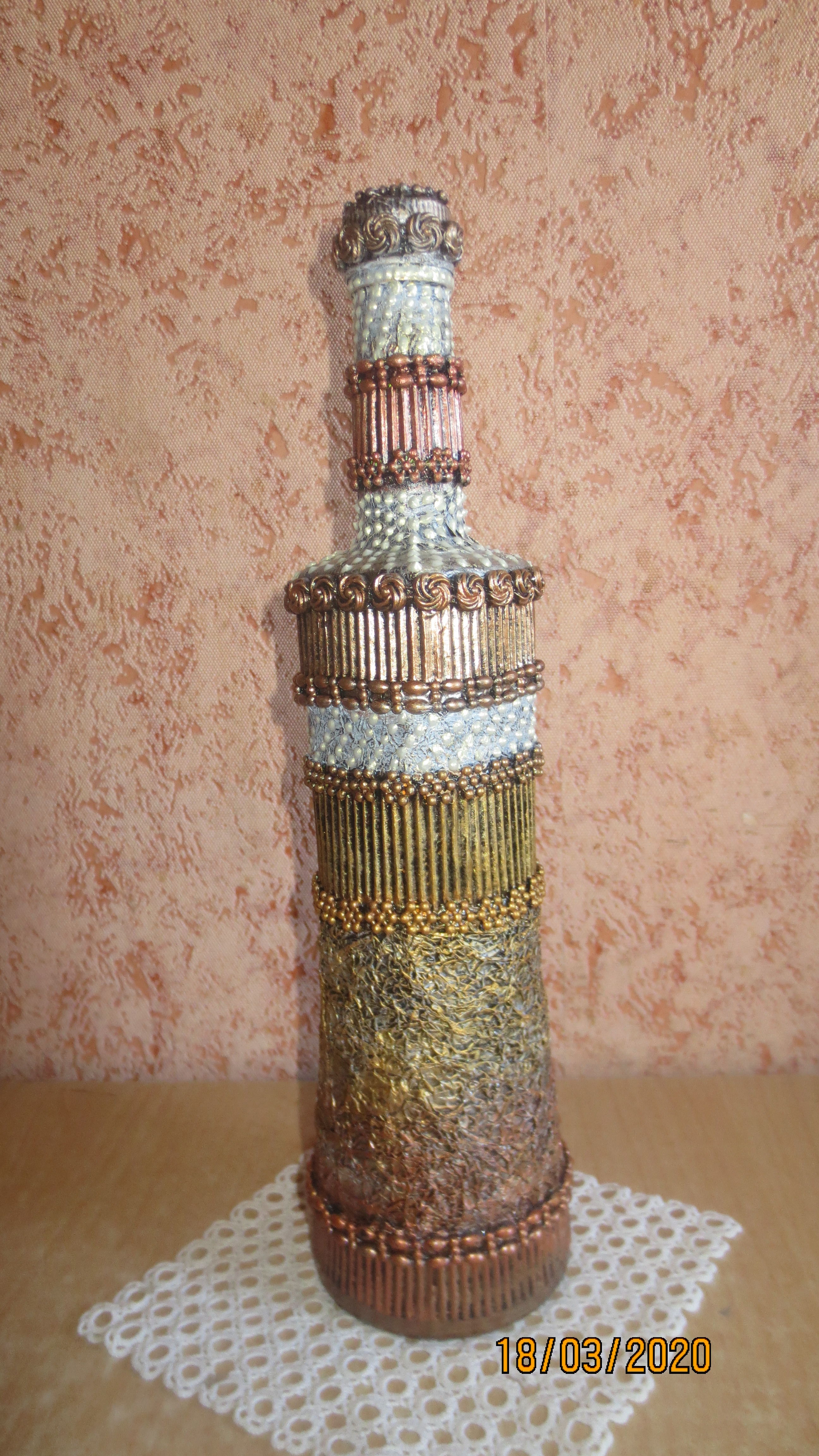 С фольгой классно получилось, но у второй бутылочки немного перебор с текстурой, хотя гофра выгодно разделила бутылочку на зоны - и по цвету и по текстуре — в целом получилось не плохо… Понимаю, Надежда, каждый раз придумывать новое сложно, особенно когда хочется что-то нового, потому ненавязчивый совет — попробуйте ещё «поиграть» с этими же текстурами — получите интересную серию и, уверена, найдете новые интересные решения!