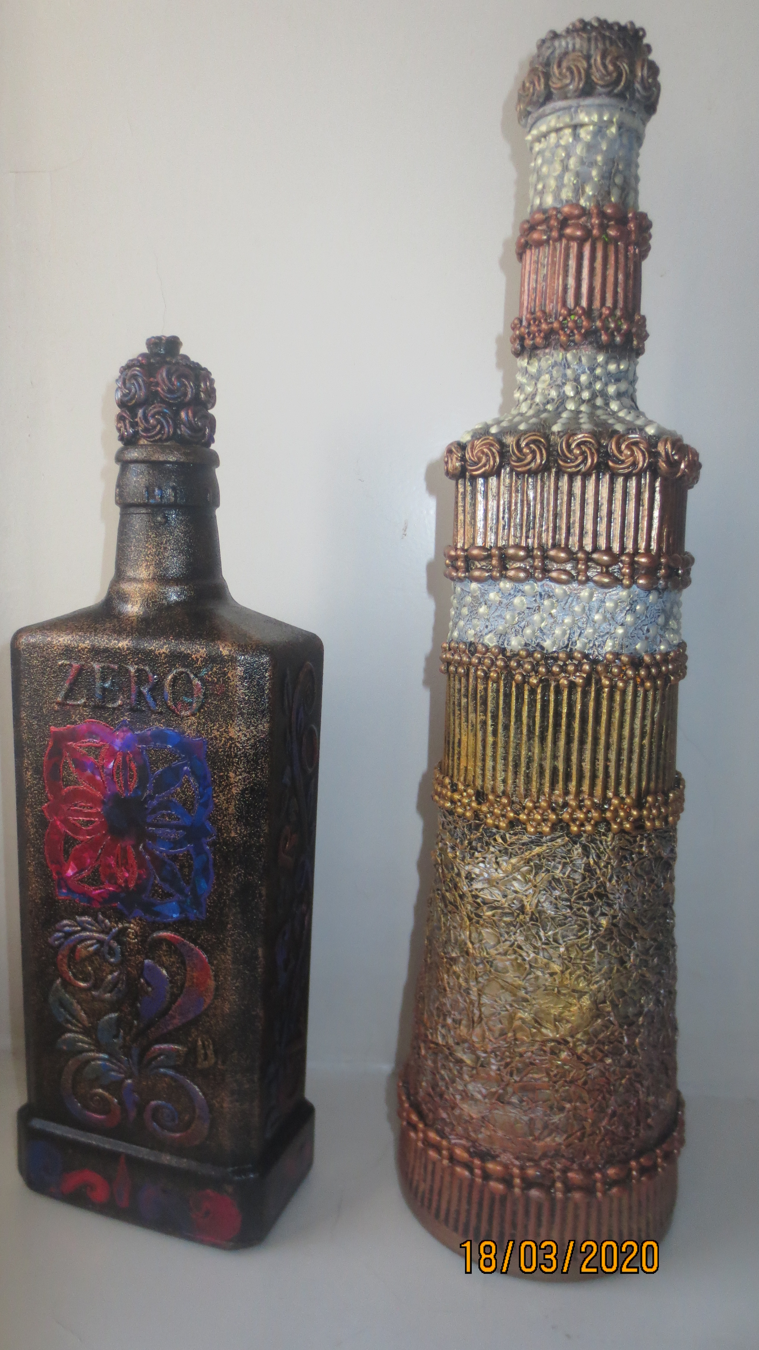 Две бутылки,одна из которых с родным выпуклым рисунком на стекле.И так сама по себе красивая.Вторая обычная стеклянная.Использовала акриловые краски,клей ПВА,пластмассовый декор,фольгу,контур,гофрированный картон,фольгу для дизайна ногтей.