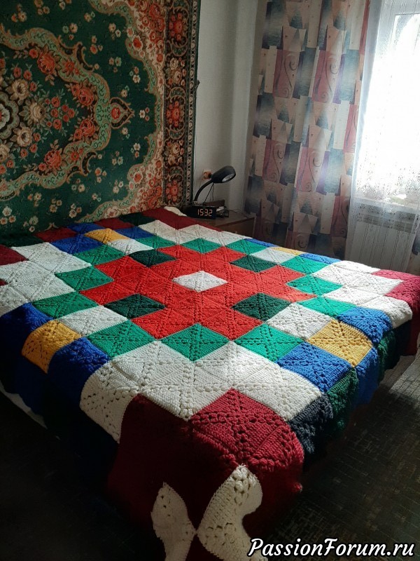 Хотела связать плед, а получилось большое покрывало. Оцените, пожалуйста, мои старания.