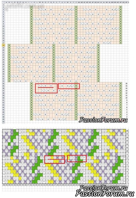 Добрый день, я связала джемпер по нижней схеме, только к концу работы поняла, что она с ошибкой. Кроме того, на что обратила внимание Галина, есть ошибка в последнем лицевом ряду раппорта — я отметила на схеме, чтобы долго не объяснять. Рисунок получился немного другой — нельзя, на мой взгляд, сказать, что некрасивый, но более сглаженный. Теперь хочу связать джемпер по верхней схеме, к тому же это несравненно легче, т.к. ни изнаночные ряды, ни последний лицевой ряд раппорта по верхней схеме не требуют особого внимания.