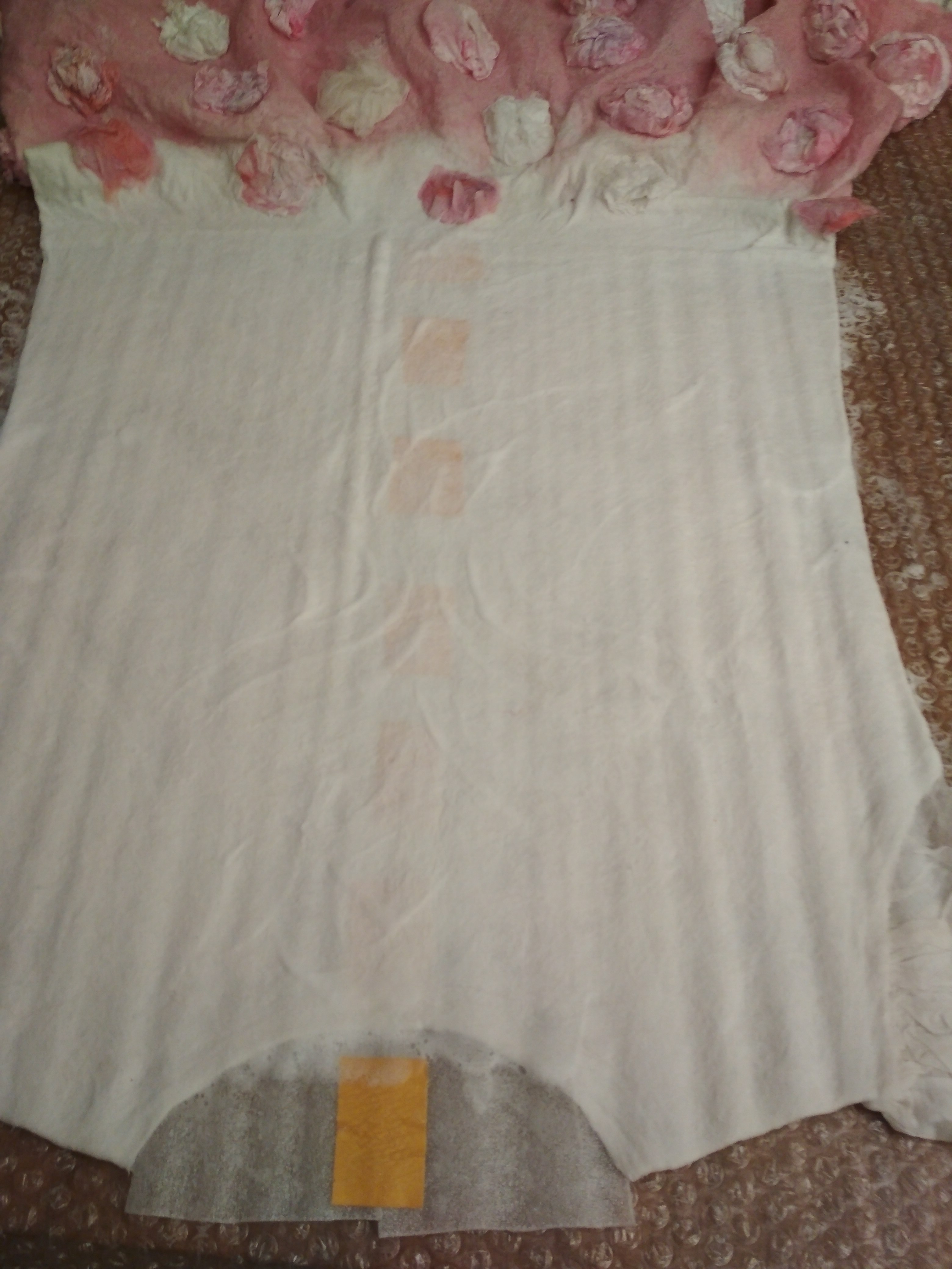 Так как работа эта заняла большое количество времени(больше четырех часов!!!!!!!), а платье очень тоненькое, то мои уже расправленные цветы высыхали махом. Иногда даже приходилось их еще раз мочить из пульверизатора.