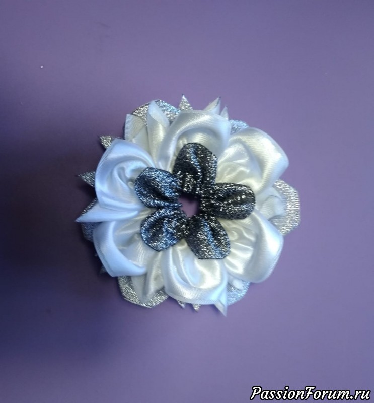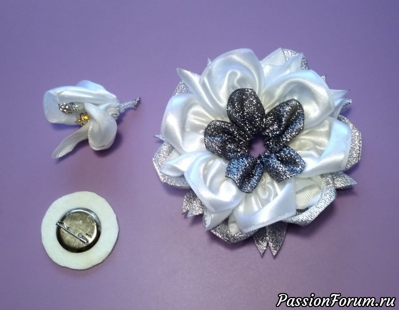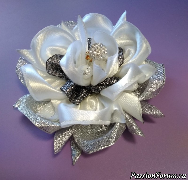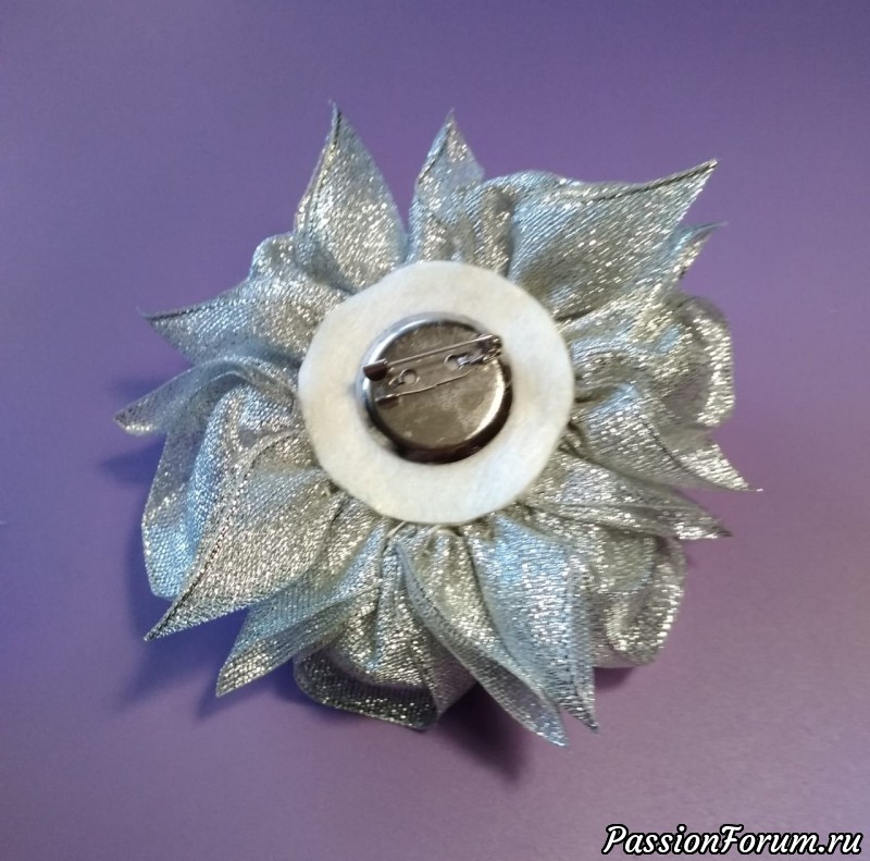 Сборка за мной. Сшив между собой по кругу серебристый и белый ярусы броши, приложила сверху первый выполненный ярус из блестящей ткани с люрексом. Не понравилось. Цветок бледный, все три яруса сливаются. Не смотрится совсем. Ищем выход из этого положения. Примеряем другие ткани, ленты. Приложила готовую заготовку из темно-серой парчи шириной 2.5 см, оставшейся от последней броши "Весеннее пробуждение". Тогда сделала их несколько из разных цветов парчовых лент. Вроде брошь ожила. Сразу стали различаться белый и серебристый цвет нижних ярусов. Показала Насте, она одобрила мой выбор. Решили оставить так. Вот что значит контраст!... А заготовка из блестящей ткани с люрексом найдет своё применение в какой-то будущей броши.