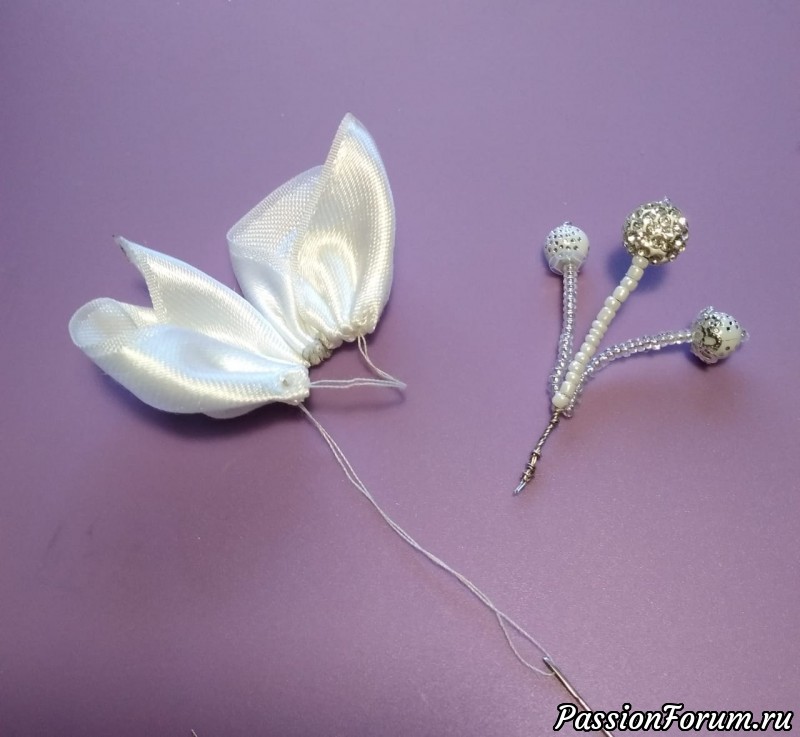 Приклеила горячим пистолетом третий ярус из темно-серой парчи к двум первым. А Настя этим временем делала бутон для цветка из двух прямоугольных трапеций белой атласной ленты, как в Солнечной броши. Ниточку не затянула, чтобы потом вставить в бутон готовые красивые тычинки-серединки.