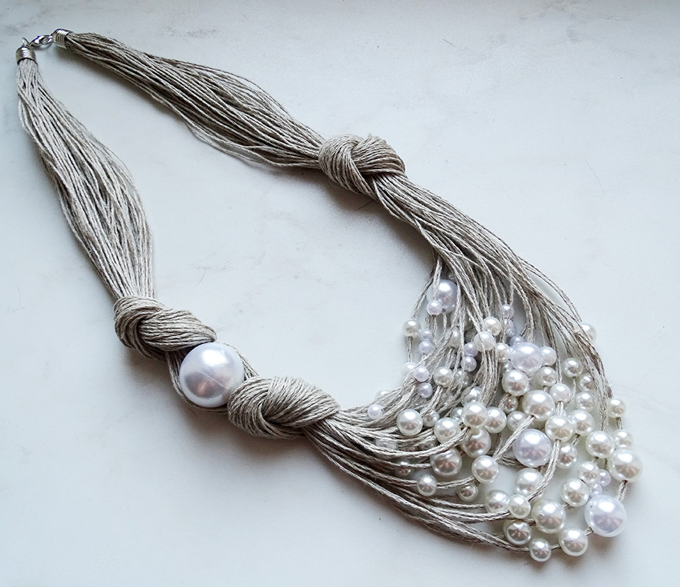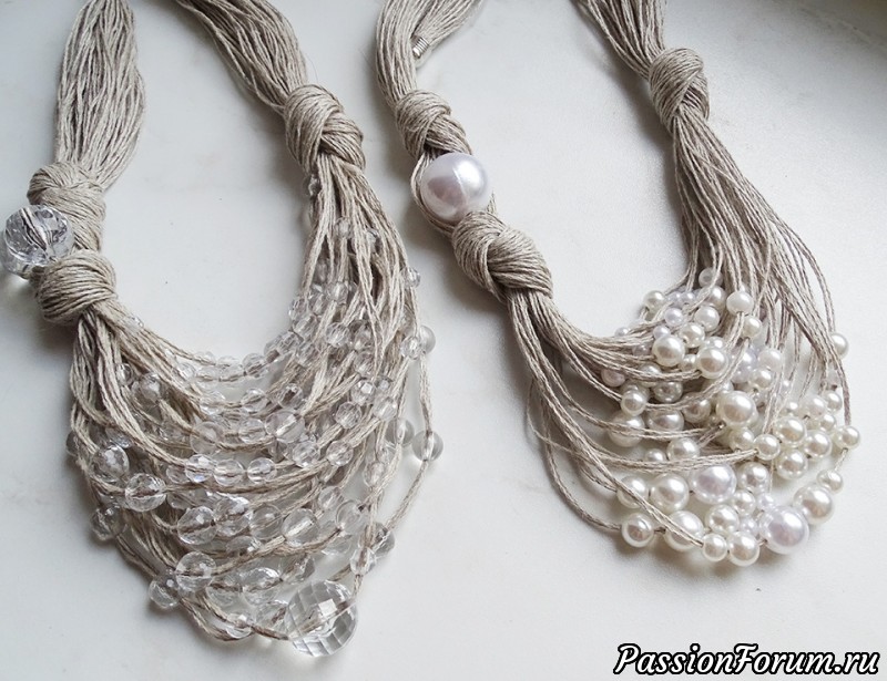 Очень необычно смотрятся жемчужные бусины с простыми льняными нитками. Мне оба нравятся.