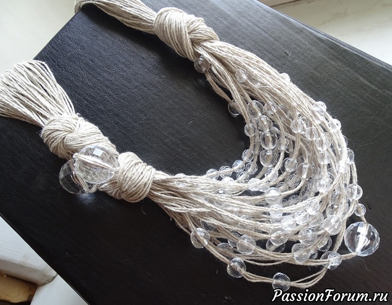 Вернулась к летним украшениям из льна и бусин. Представляю два ожерелья .