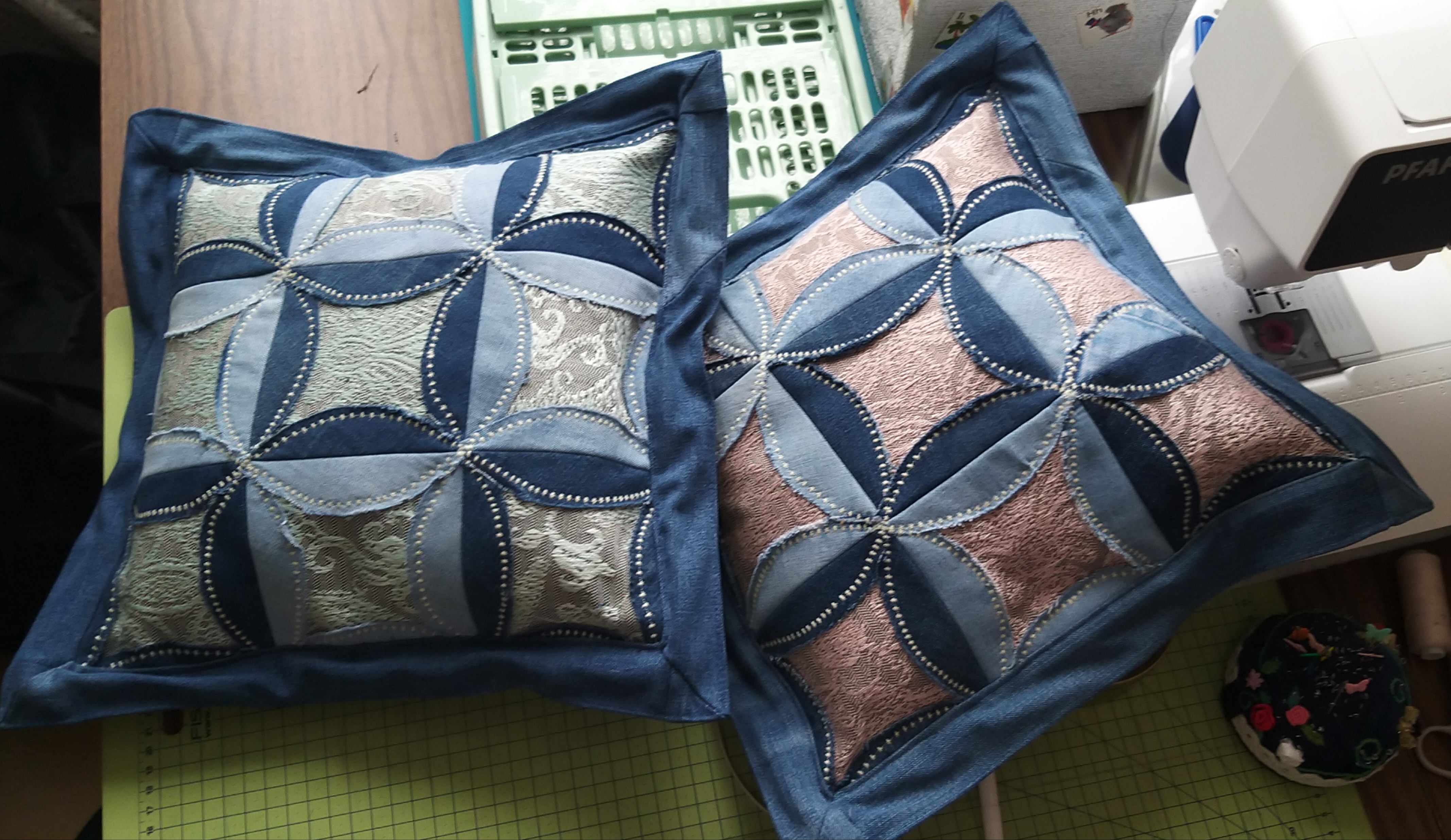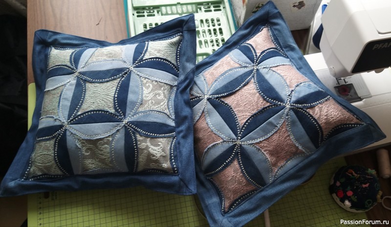 Мне тоже больше чехлы напомнило сине-голубое небо!!! Таня, на наволочках лепестки пришиты каким-то швом специальным? Отличная работа!!!