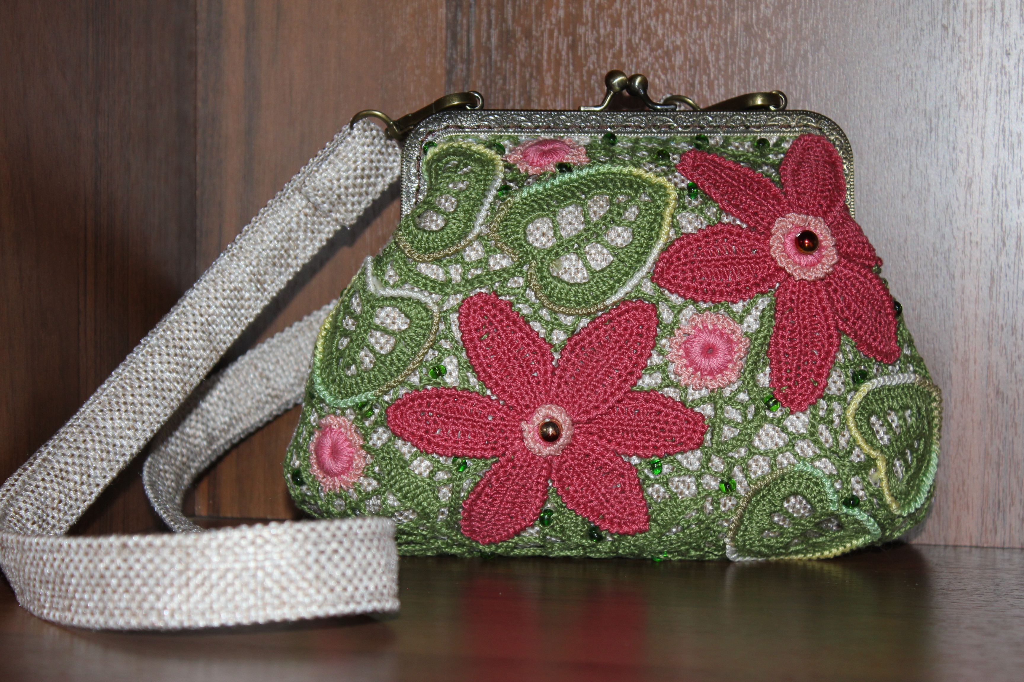 Третья неделя добровольного домашнего ареста увенчалась пошивом маленькой сумочки. Подробности: фермуар 15 см, основная ткань - рогожка, внутри - полиэстер+синтепон, небольшой карман. Размер сумочки - 25х19 см, ремешок на карабинах длиной 90 см. Декоративная вставка связана крючком. Пряжа - Ирис,Денди,Виолет. Немного бусинок. Выкройка построена по методу нашей мастерицы Людмилы (Амели). Схемы листиков и цветов - из Журналов Мод "Рукоделие".