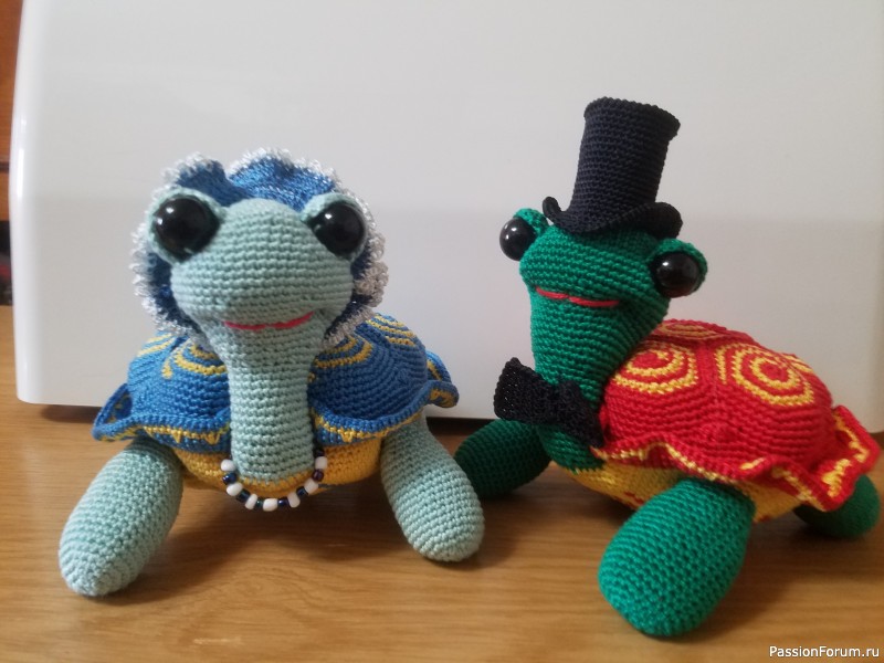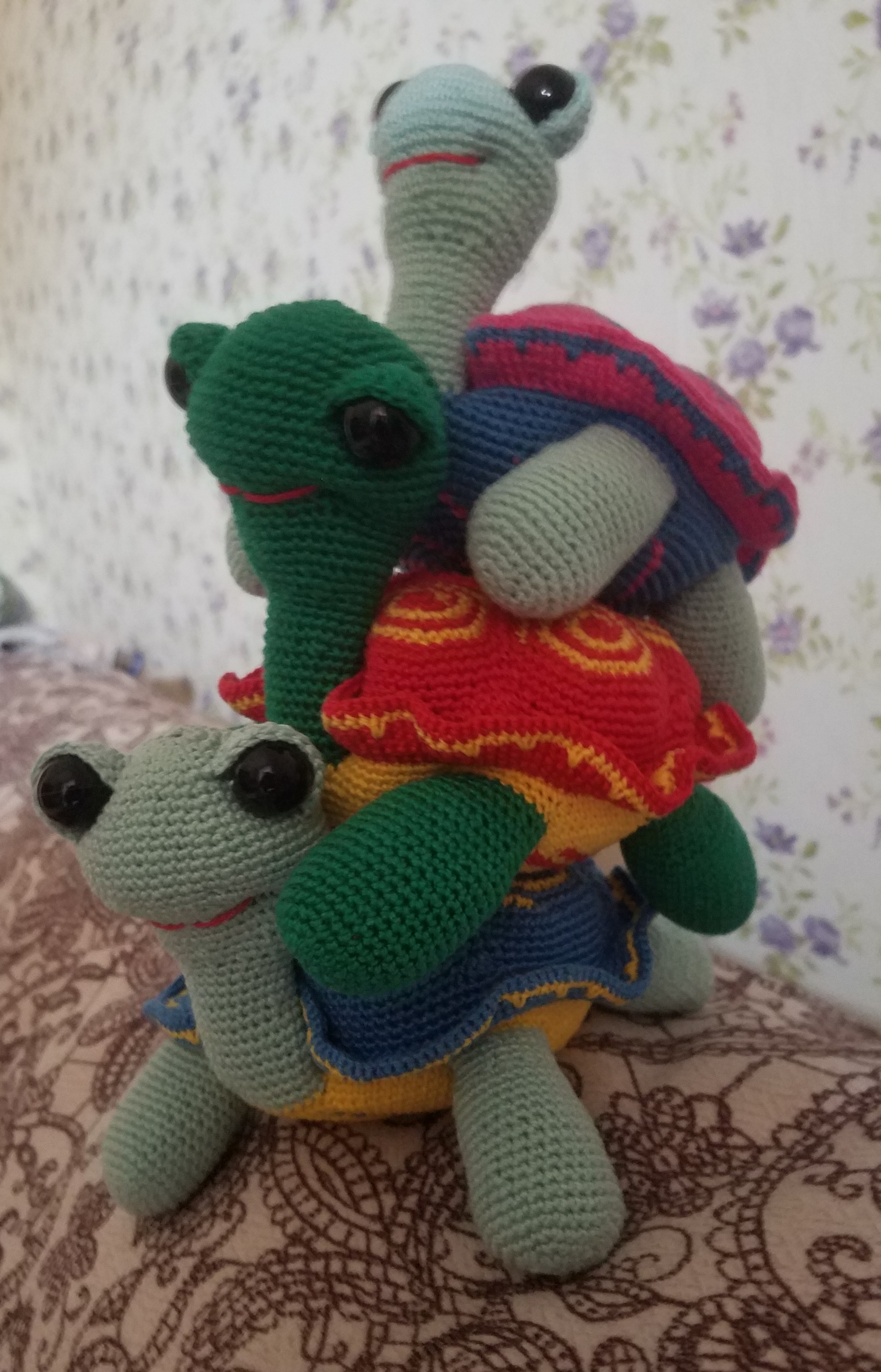 Альбина, вот честно — равнодушна к вязаным игрушкам абсолютно. Но твои черепашки сразили наповал — такие позитивные, каждая со своим характером. Пара, что отправилась жить в магазин непременно принесет удачу и прибыль их владельцам. Огромный привет Мише!