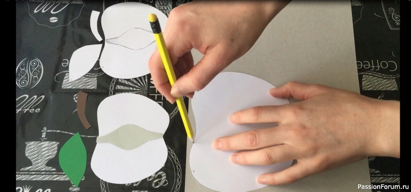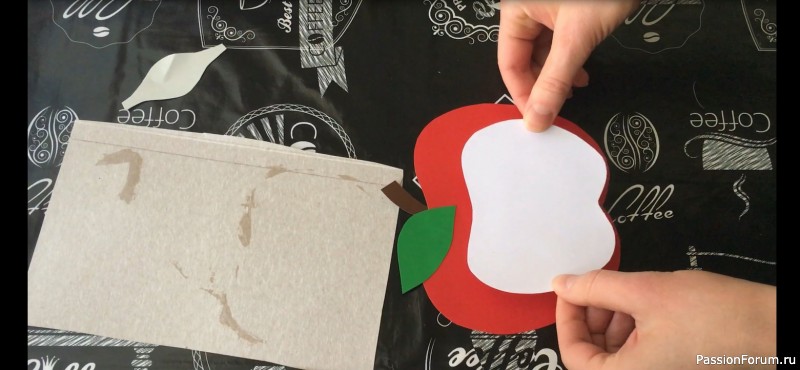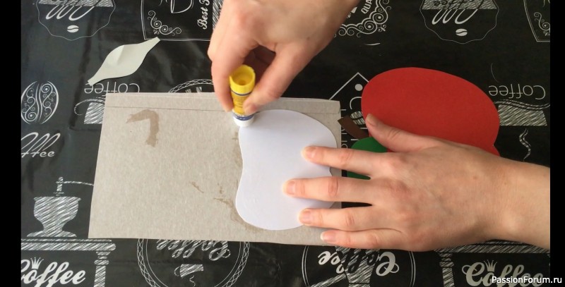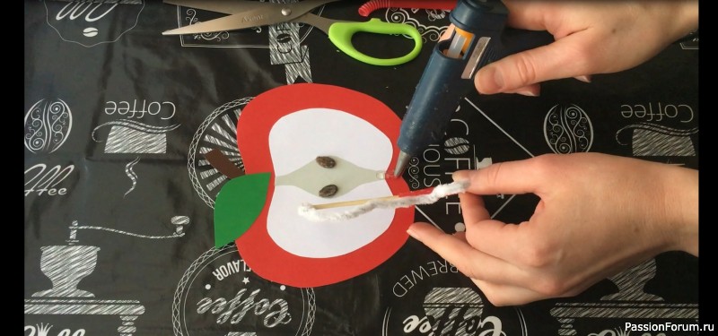 Вырезаем все детали яблока по шаблону и приклеиваем с помощью клея карандаша.