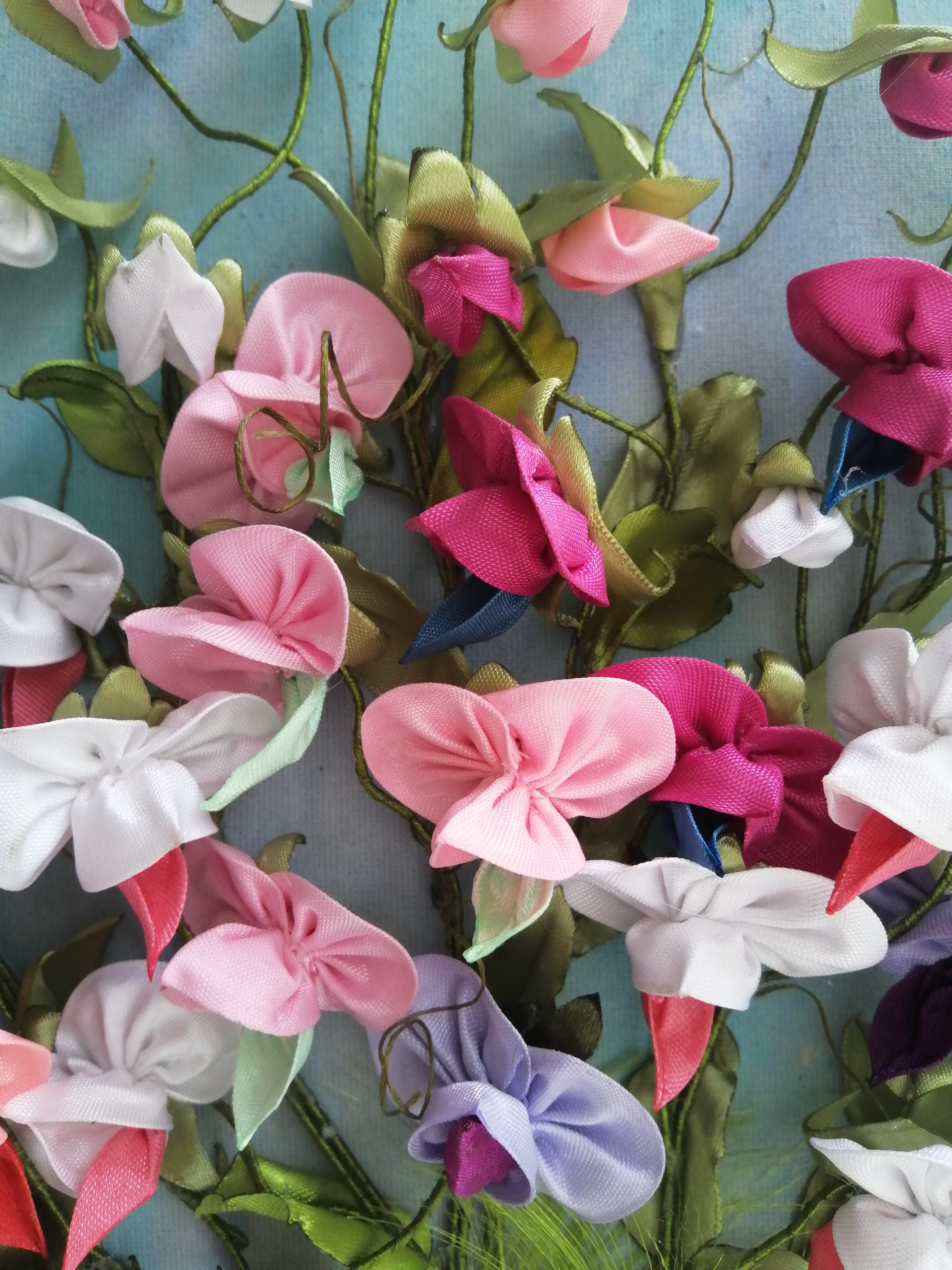 Основа лен, тонирована акриловыми красками. Цветы сделаны из атласных лент по мастер класу Avonessa Fabric Flowers.