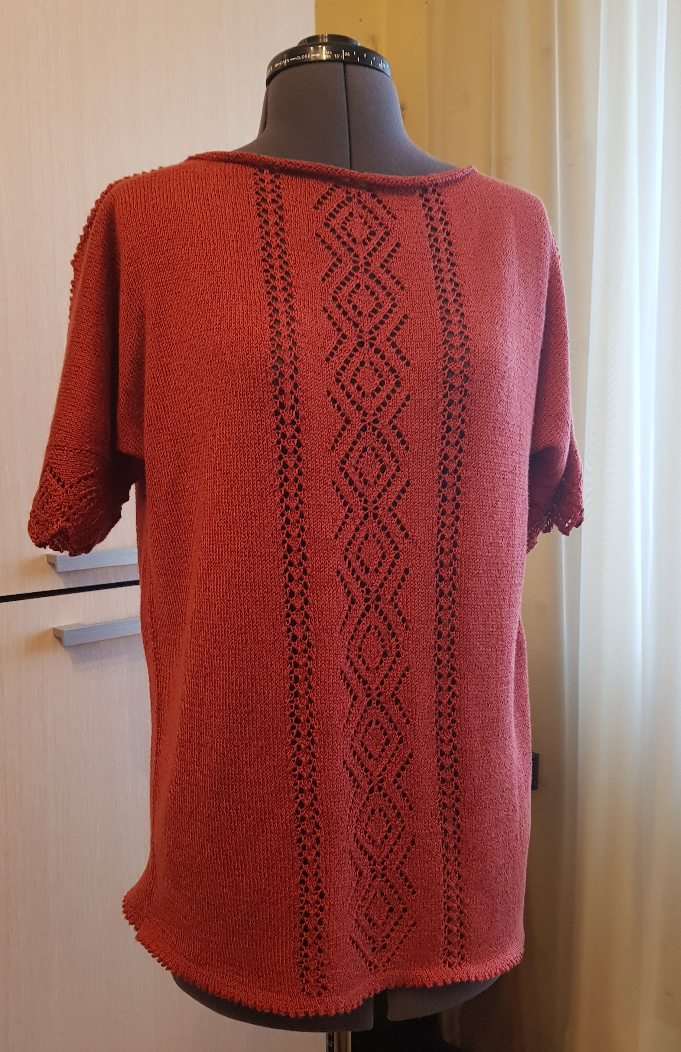 Я с отчетом о проделанной работе - летний топ из семеновской пряжи Нежность (давненько хватанула на распродаже, цвет какой-то, мягко говоря, странный... и темноват немного, нужен посветлее "низ"... в изоляции от магазинов и это пошло в дело... посмотрим будет ли это носиться) хлопок - 47%, вискоза - 53%, 400 м на 100 гр, расход ок. 350 гр., спицы 2,5. Надо было использовать двоечку, получилось бы поровнее полотно, но... что вышло, то вышло
