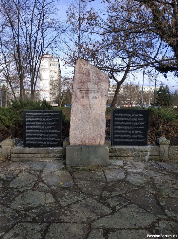 Это настоящая братская могила. Сфотографирую поближе мраморные плиты, чтобы видны были списки захороненных. Списки были получены из военных архивов. Несколько раз в год россияне, живущие в Бургасе, приходят на могилу, приводят в порядок, убирают упавшие с деревьев ветви, рыхлят землю, стригут разросшиеся кусты, подсаживают новые цветы. Занимаются этим 2 бургасских клуба -- «Родник» и «Русь».