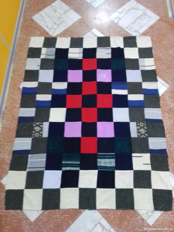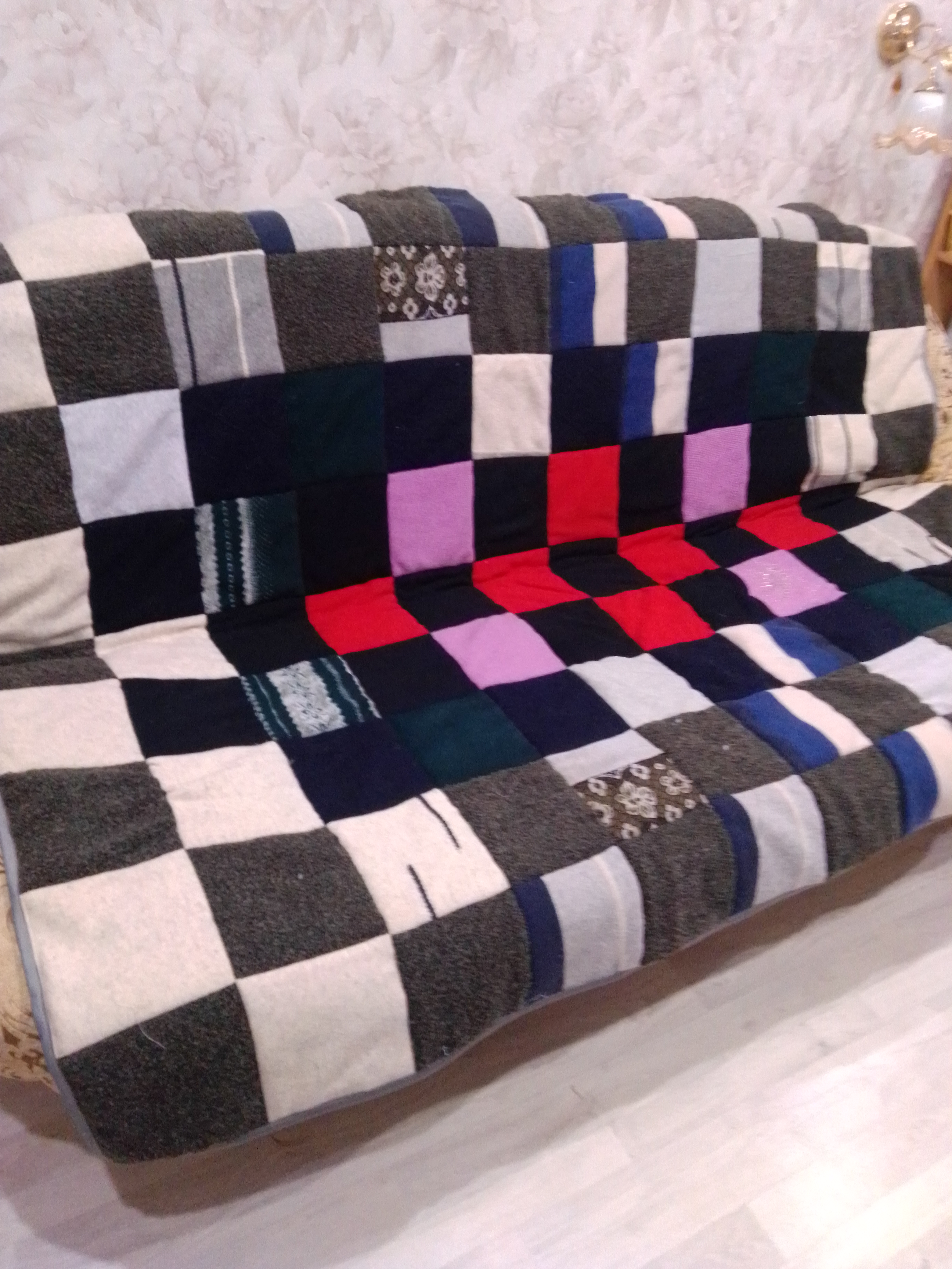 Приветствую всех рукодельниц и хочу показать плед, сшитый из разных трикотажных свитеров. Так как свитера были толстые, плед получился довольно весомый. Основа - бязь и синтепон. На дворе тёплая погода, плед пролежит до холодов и в прохладную погоду им будет приятно укрыться. Приятного просмотра.