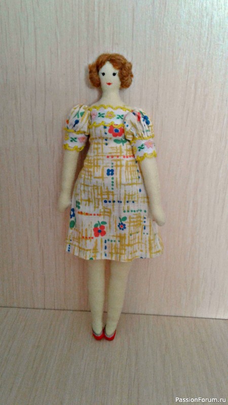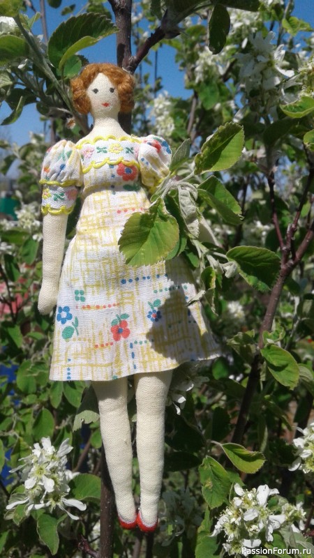 Руки скроила по-своему, пришивала их не как мастер показала, прическу сделала другую, в чулочки куклу не наряжала и платье сделала не кукольное "дитячье", а по фасону напоминающее настоящее женское. На кукольном платье попробовала сделать складки при помощи клея ПВА. Сшилась куколка легко и быстро.Я по-настоящему получила удовольствие от процесса создания этой малюсенькой девушки!
