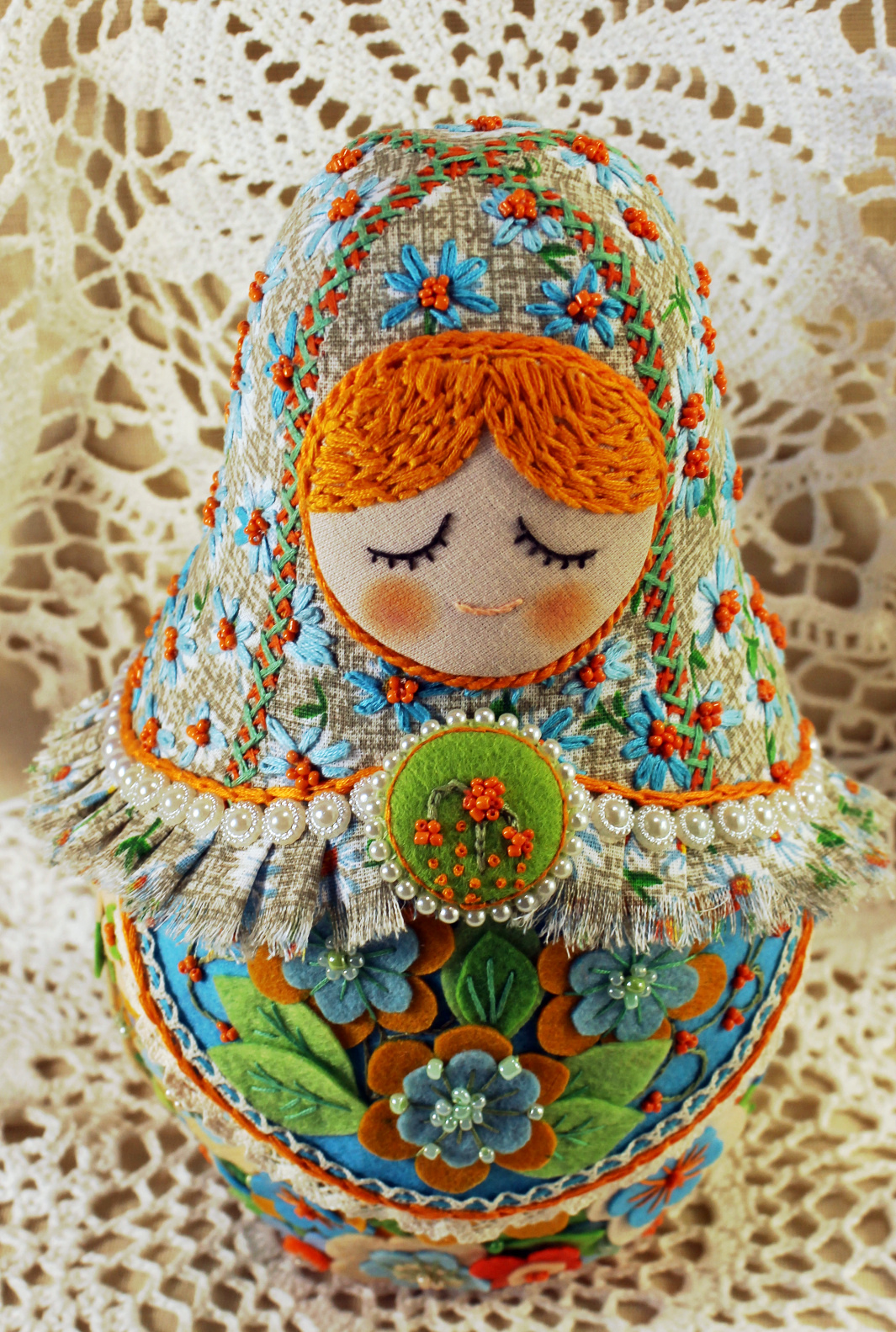 Куклы и композиции по мотивам Козыревой отличные! Но Матрешка для меня оказалась самой лучшей в этой подборке Ваших работ! сколько вышивки, декора из фетра, бисера, тесьмы.И эта вся красота на небольшой куколке, всего-то 25 см. Чудесная Матрешка!