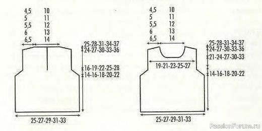 Горловина. На высоте 21/24/27/30/33см от начала работы закрыть средние 14/16/18/22/26п. и закончить обе стороны раздельно. Закрыть в каждом 2-м р. 1 раз 4п., 1раз 2п., 3 раза по 1п.