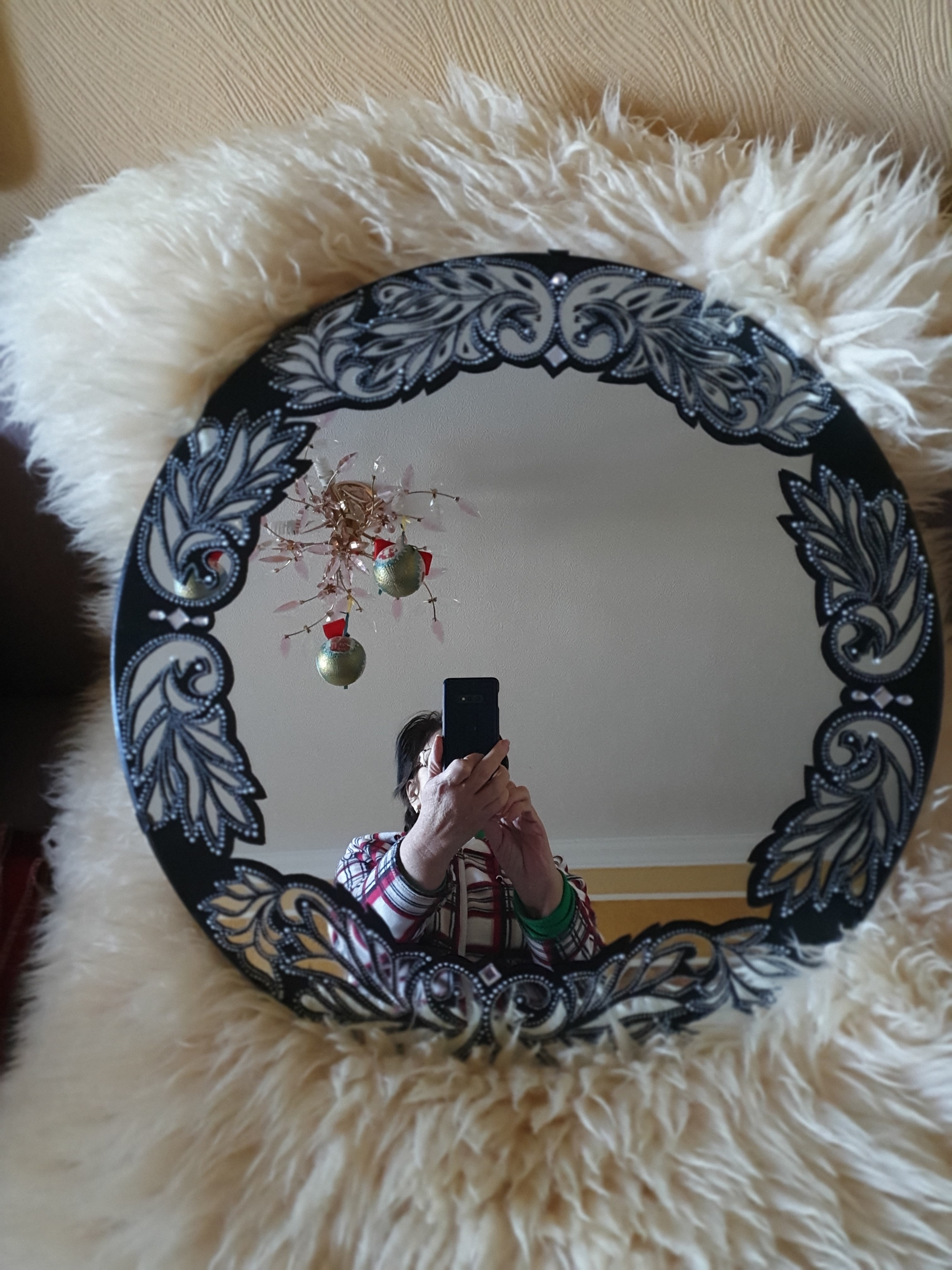 Беллочка! Приветик дорогая!!! как справляешься с карантином у вас уже получше слава богу! зеркало- черным акрилом хаотично закрасила по окружности нанесла через копирку рисунок и скальпелем вырезала по рисунку и счищала акрил скальпелем потом контур серебро потом белый стразики и все Спасибо за внимание здоровья радости !!!!!!!!!!!!!!!!!!!!!!!!