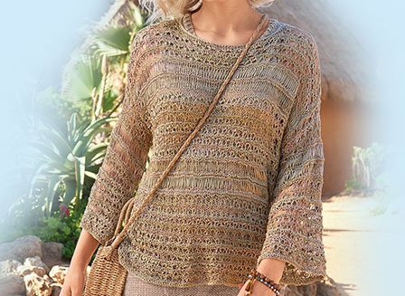 Матово-блестящая пряжа создает особую динамику, которая делает каждую модель неповторимой. В этом объемном джемпере полосы со спущенными петлями чередуются с фантазийным узором.