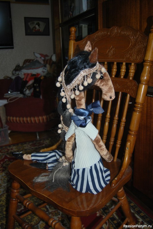 Лошадь сшита из бархата-ламбрекен от гардины, вся одежда-из запасных лоскутков ,рост 93 см.