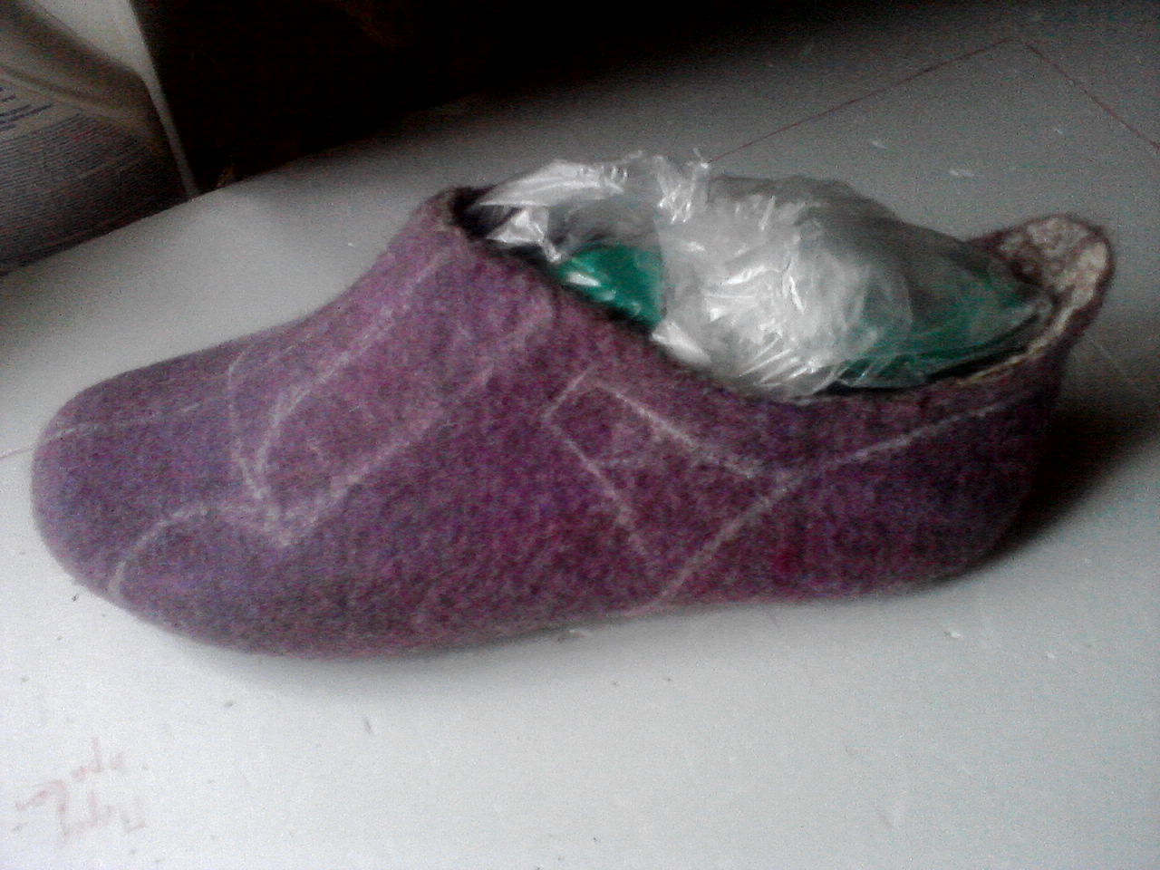 Давно уже ждала своего часа заготовка, сделанная на стелечном шаблоне. Всё ещё не могла решиться, что из этого полуфабриката сделать. Были уже сваляны ботиночки и сапожки, не хватает весенней обуви. И работа сдвинулась с места. Шерсти пошло 180г. Смесь домашней и кардачеса . Отдельно сваляла войлок укрепить пятку и сделать цельноваляный язычок с носком. Подошва проклеена и пришита.