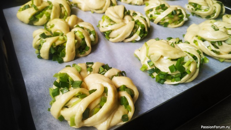 Подошедшее тесто осадить и разделить на 16 частей. На стол налить немного растительного масла и растянуть кусочек теста руками в овал. Сделать надрезы от края к краю, не разрезая сами края. Сверху посыпать рубленным зеленым луком и свернуть наискосок, затем свернуть в улитку. Таким образом сформировать все булочки.