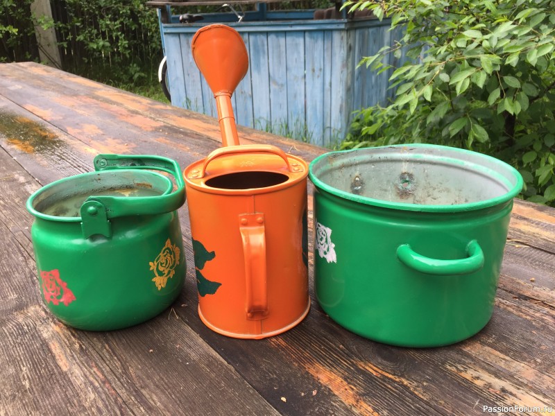 Если честно, эта посуда давно уже должна была почивать на свалке где-нибудь, ну прямо очень давно! Всё облупленное, ржавое, да дырявое. Валялось... фиг его знает сколько. Так нет же, дочке она по зарез понадобилась в качестве плошек под цветы (в меня пошла
