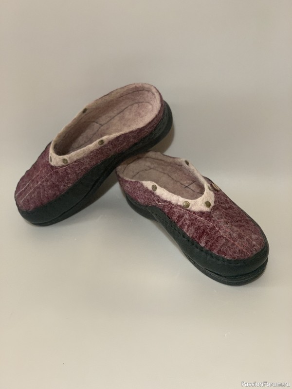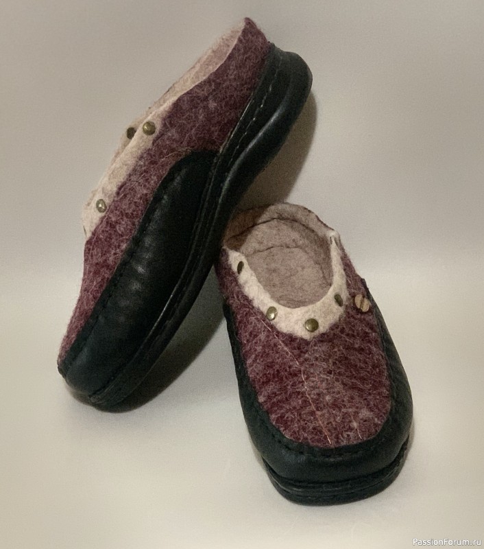 Девочки)! Всем говорю Вам доброго здравствуйте)! Вот и пришло время обратить свое серьезное внимание, на любимую. домашнюю обувку мужа. Она давно проходила методы реставрации, но всему свое время. И время пришло. Скажу сразу- идея была сначала свалять полотно, раскроить союзку, отформовать ее на колодки и собрать что- то похожее на оригинал. Но на глаза попалась пара- которая больше года назад была сваляна в качестве образца- в которой тестировалась домашняя шерсть которая пролезла куда только и через, что только можно и дала такую пушистость- за что были отставлены и наверно ждали своего времени и своего часа.