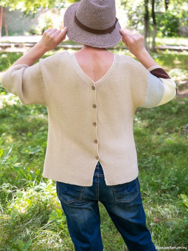 здравствуйте. Хочу представить вам свою карантийную работу. Она почти месяц ждала пуговок. Не знаю как её правильно назвать, пусть будет кофта. Размер 44-48. YarnArt style больше 450г, спицы 2.75. Платочная вязка, края - двойная краевая(Я еще тамбуром пришлась, боялась что в висе платочка сильно вытянется). Застежка ложная. Плечи закрывала методом "три спицы".