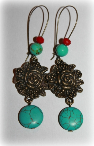 Комплект с прессованной бирюзой и коралловыми бусинками на латунной фурнитуре.