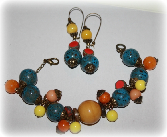 Комплект в этно-стиле. Керамические,очень крупные бусины,чешская керамика,боросиликатное стекло,кремнезем,латунь