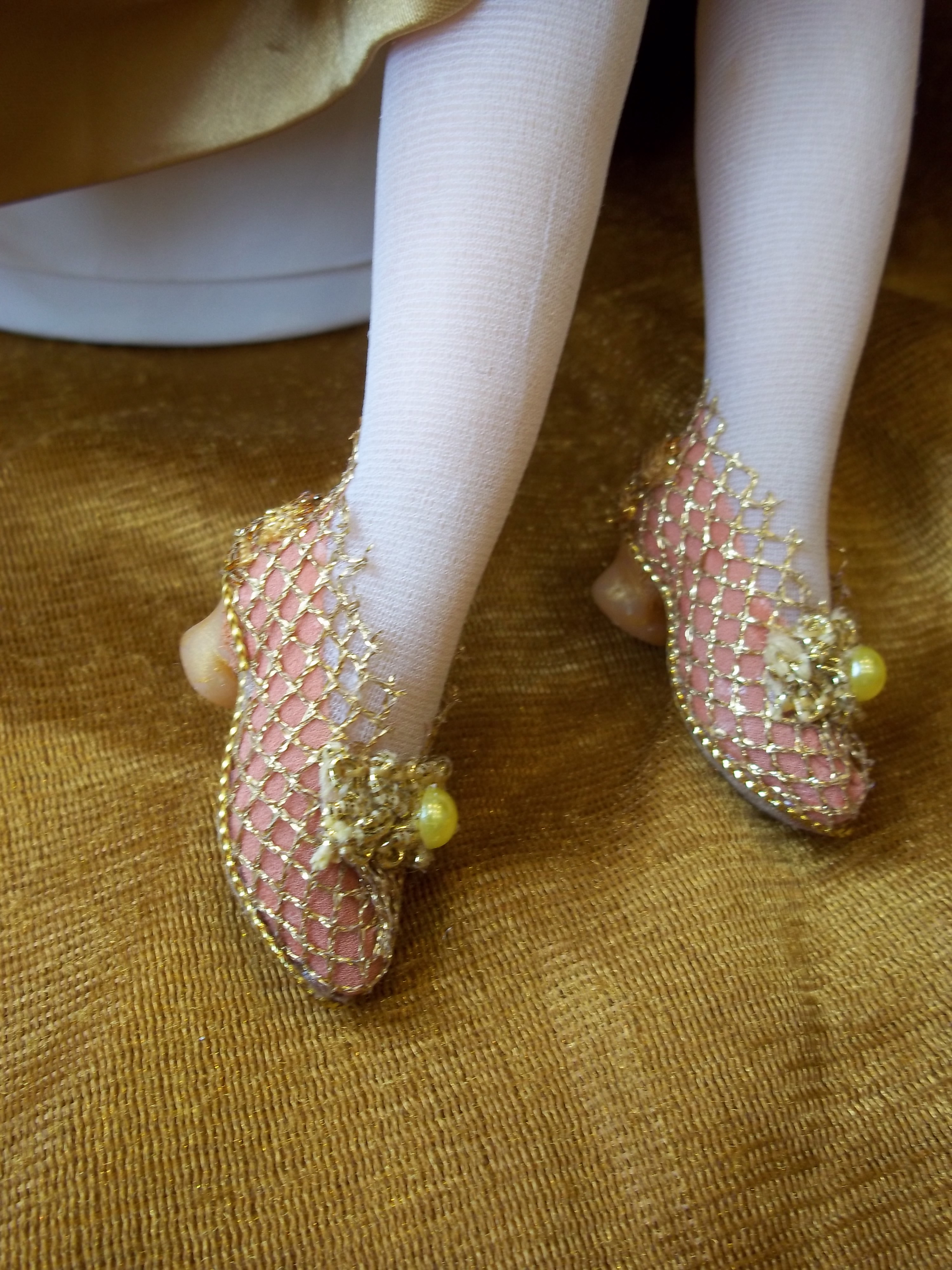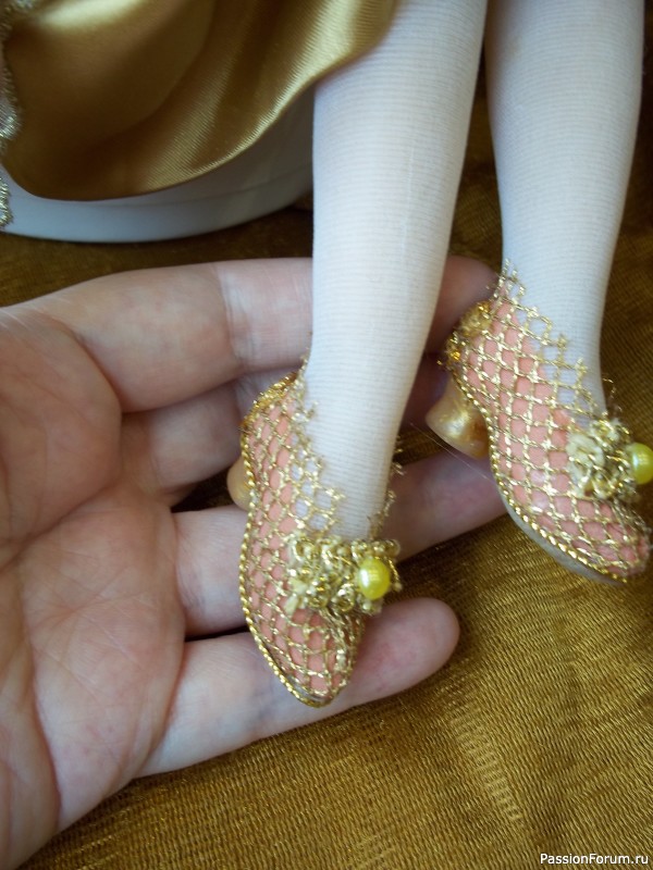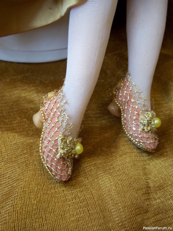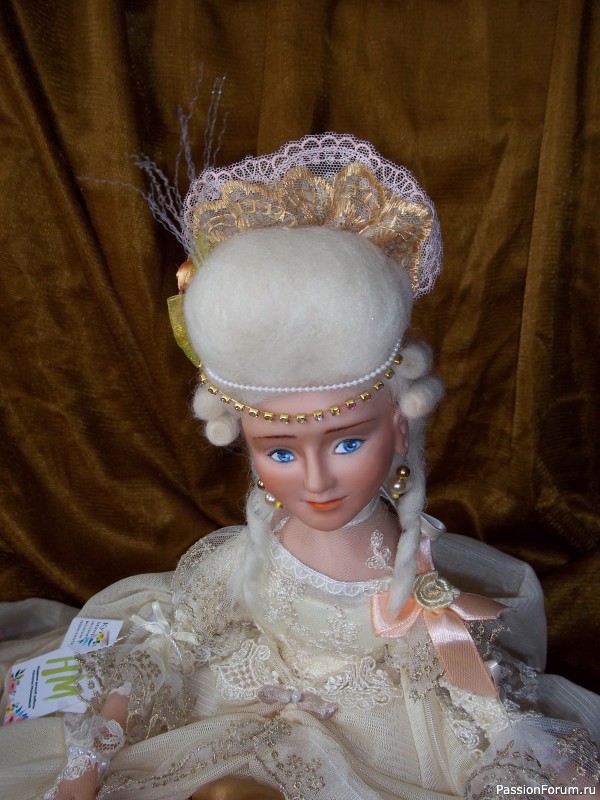 Анна- прекрасная кукла! Мне, кажется, она Вам удалась лучше остальных, очень продуманны образ и все детали. Единственное, нижнюю юбку, наверное, надо было персикового цвета, как лента и туфельки. Кстати, туфельки просто великолепны!