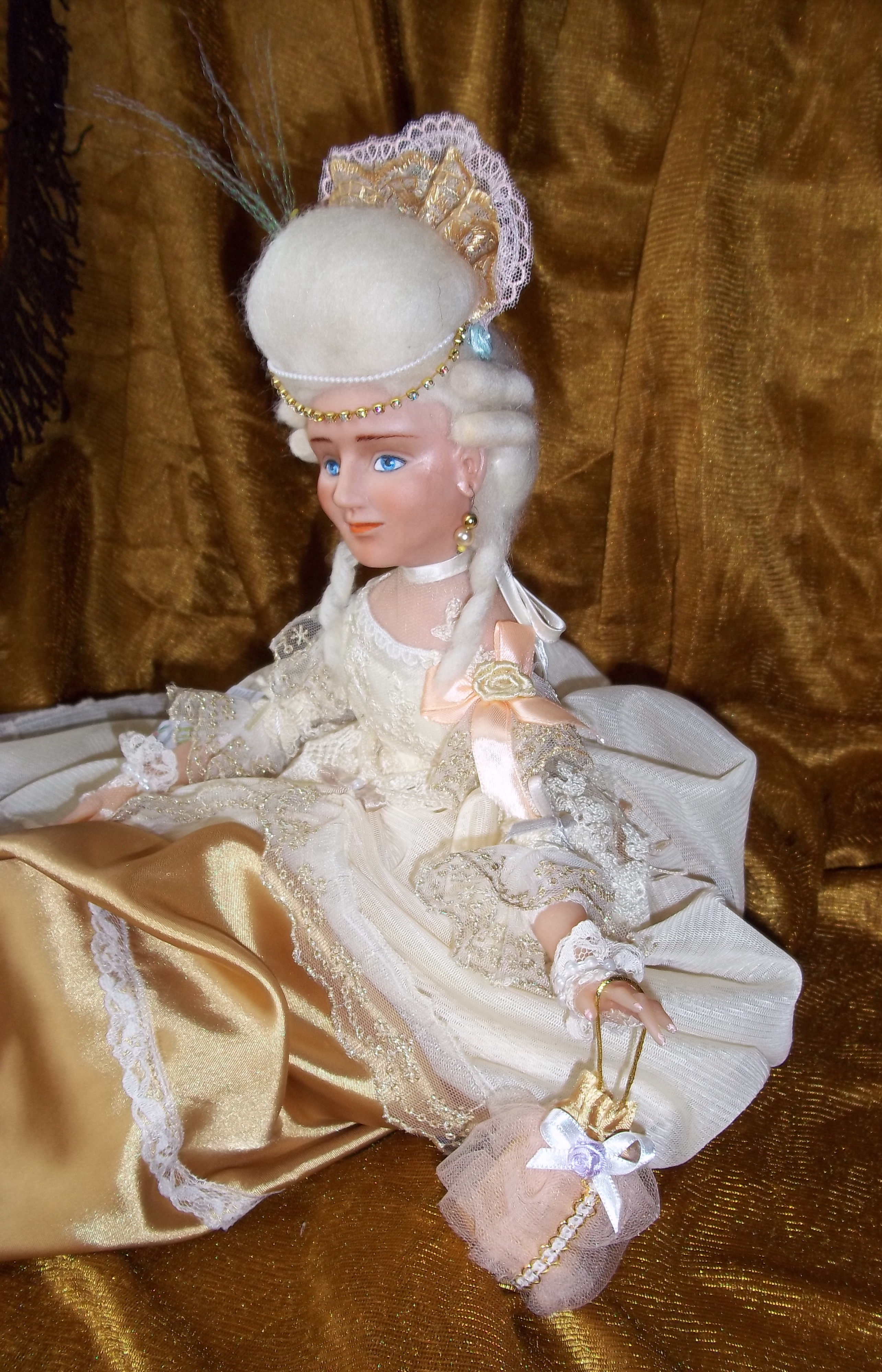 Кукла Анна интерьерная, авторская ручной работы, в смешанной технике, полимерная глина(пластик) Living doll, Cernit doll- голова, руки и ноги. Тело текстильное наполнено синтепоном, голова статичная(не поворачивается)Руки и ноги на проволочном каркасе, что позволяет принимать любые позы. Волосы из шерсти для валяния. роспись лица акриловыми, акварельными красками и пастелью, покрыто матовым лаком Mr.Super clear. Верхняя часть платья их антикварной ткани с шёлковым шитьём. Юбка из золотистой атласной ткани. На ногах капроновые чулки. Одежда не съёмная. Сумочка из той же золотистой ткани, что и юбка. На руках кружевные митенки. В причёске Фонтанж, букет цветов тоже ручной работы из атласных лент. Кукла роскошно смотрится в интерьере! Рост куклы 50 см. не стоИт, сидит сама, сидя-29 см.