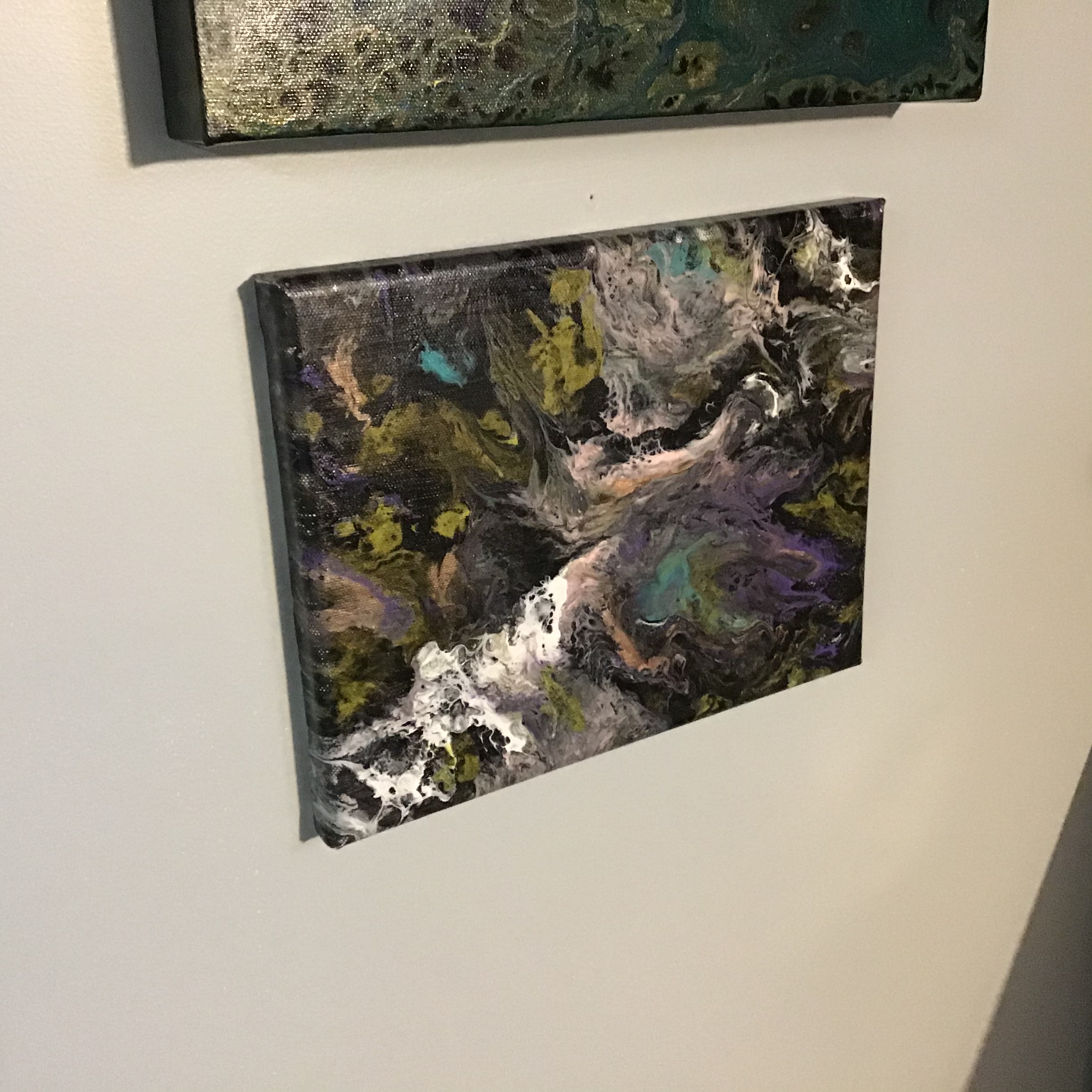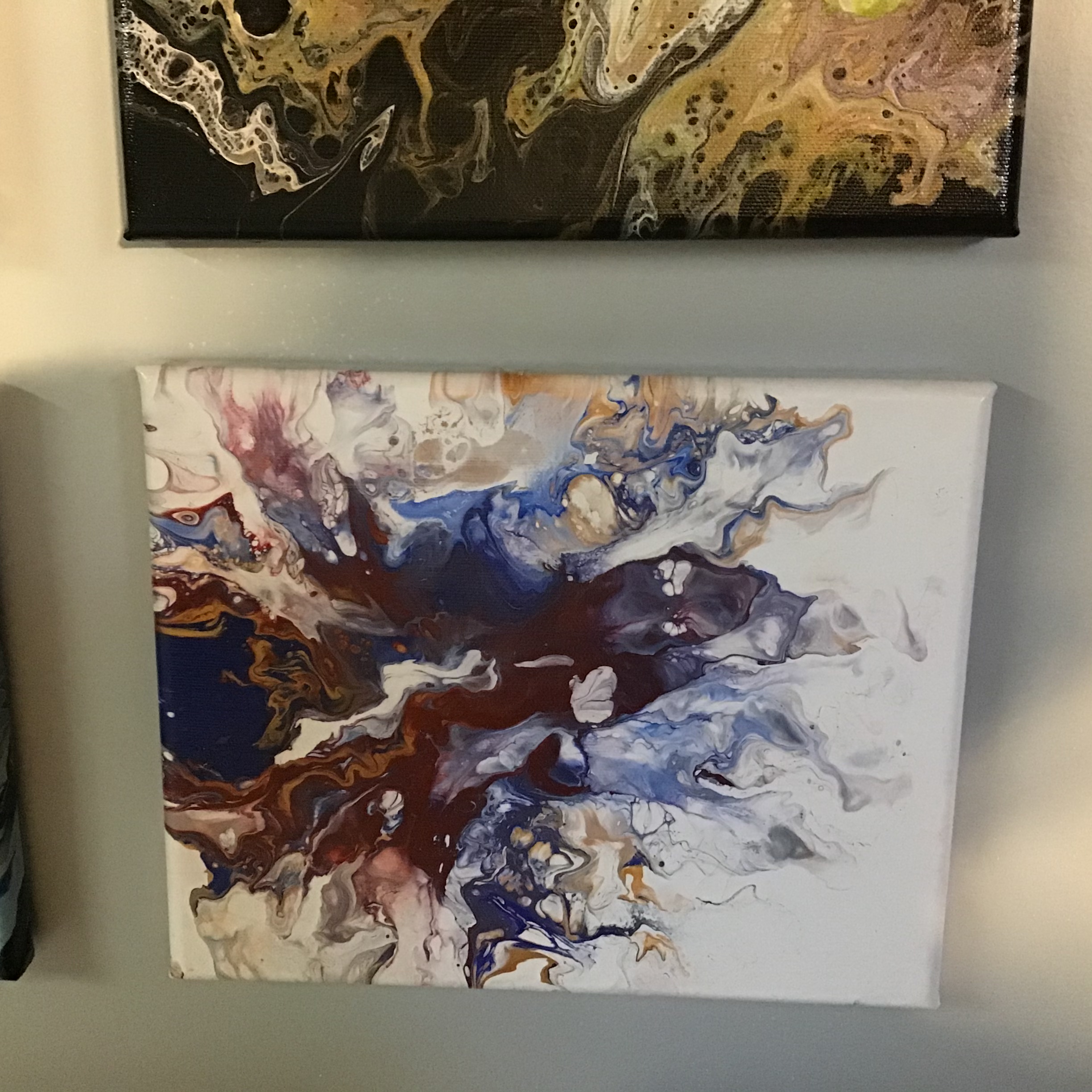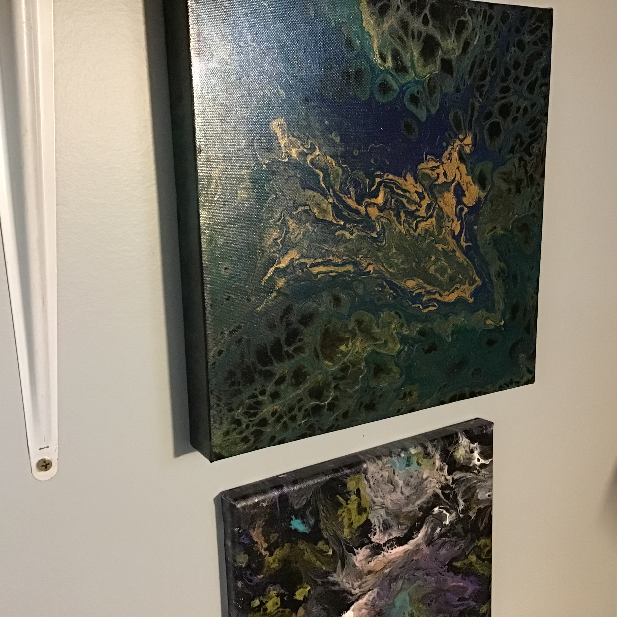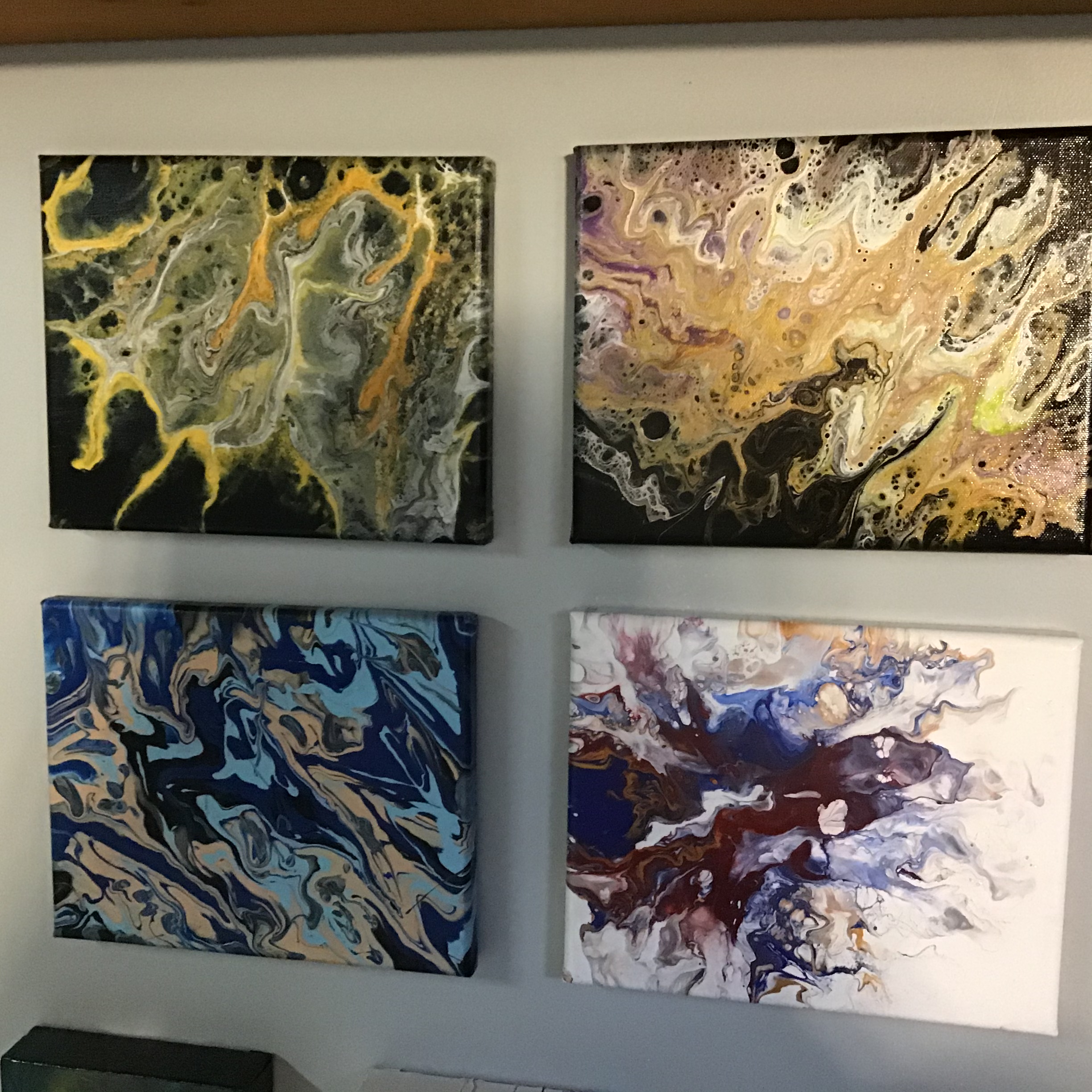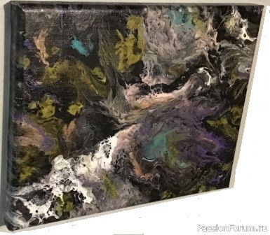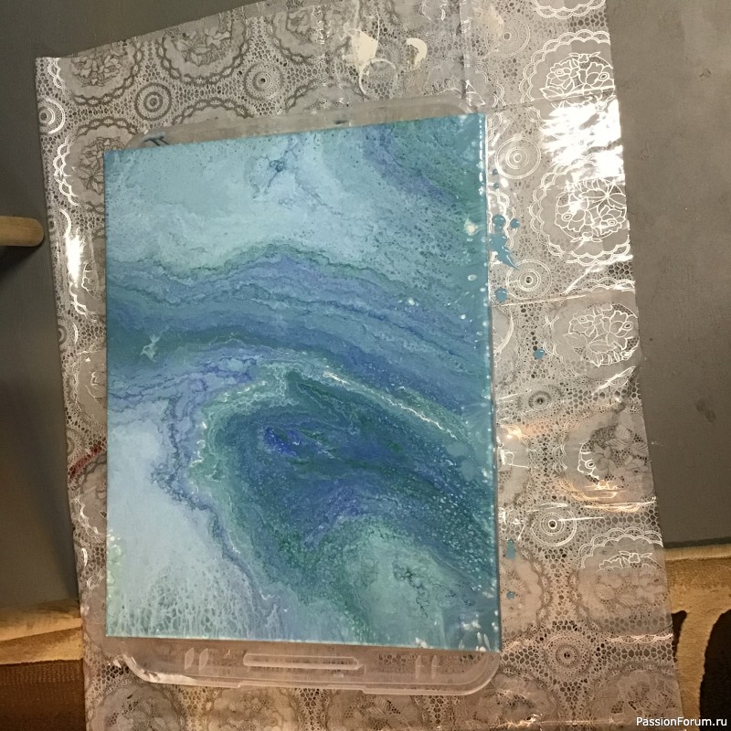 Продолжаю познавать мир акриловых заливок,или Флюид Арт,кто как называет.Занятие очень интересное и любопытное,смотрю видео,мастер-классы,накупила холстов, красок,специальных добавок. Понятно,что я только на начальной стадии и далеко не все получается- экспериментирую.Подбираю цвета,нахожу нужную консистенцию состава,пробую разные техники.Поняла,что цвета меняются после высыхания,значит это тоже надо учитывать.Должна сказать ,что заливка может получится при минимальных усилиях и количества материалов,и не получится при использовании дорогостоящих специальных добавок.Покажу то,что оставила и не смыла.Повесила на стену и поглядываю,делаю выводы из своих опытов.Кому интересен этот процесс подробней спрашивайте,расскажу с чем сталкиваюсь.
