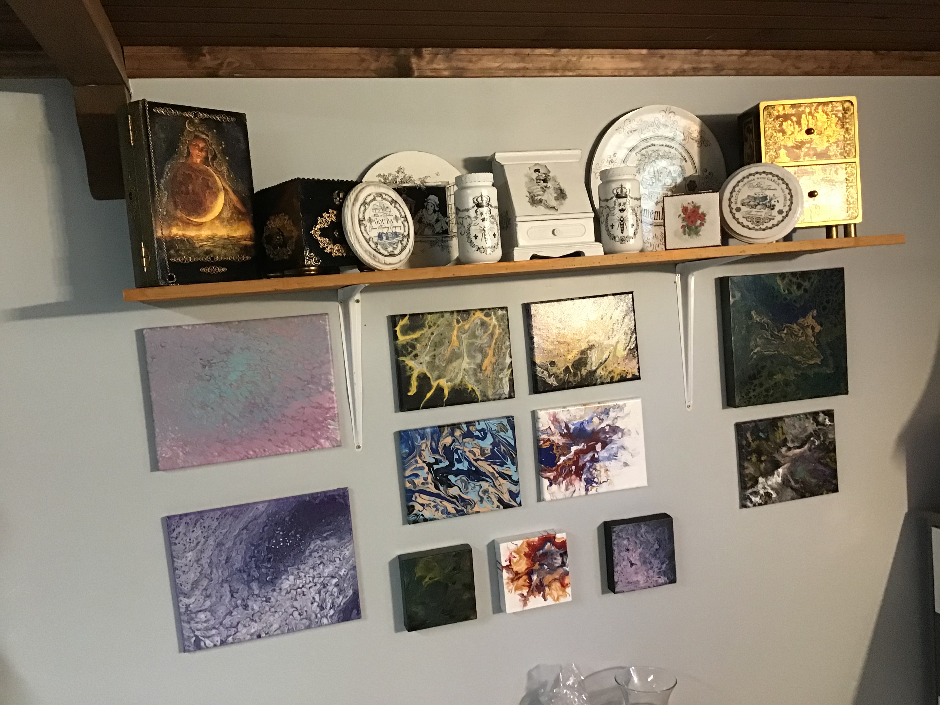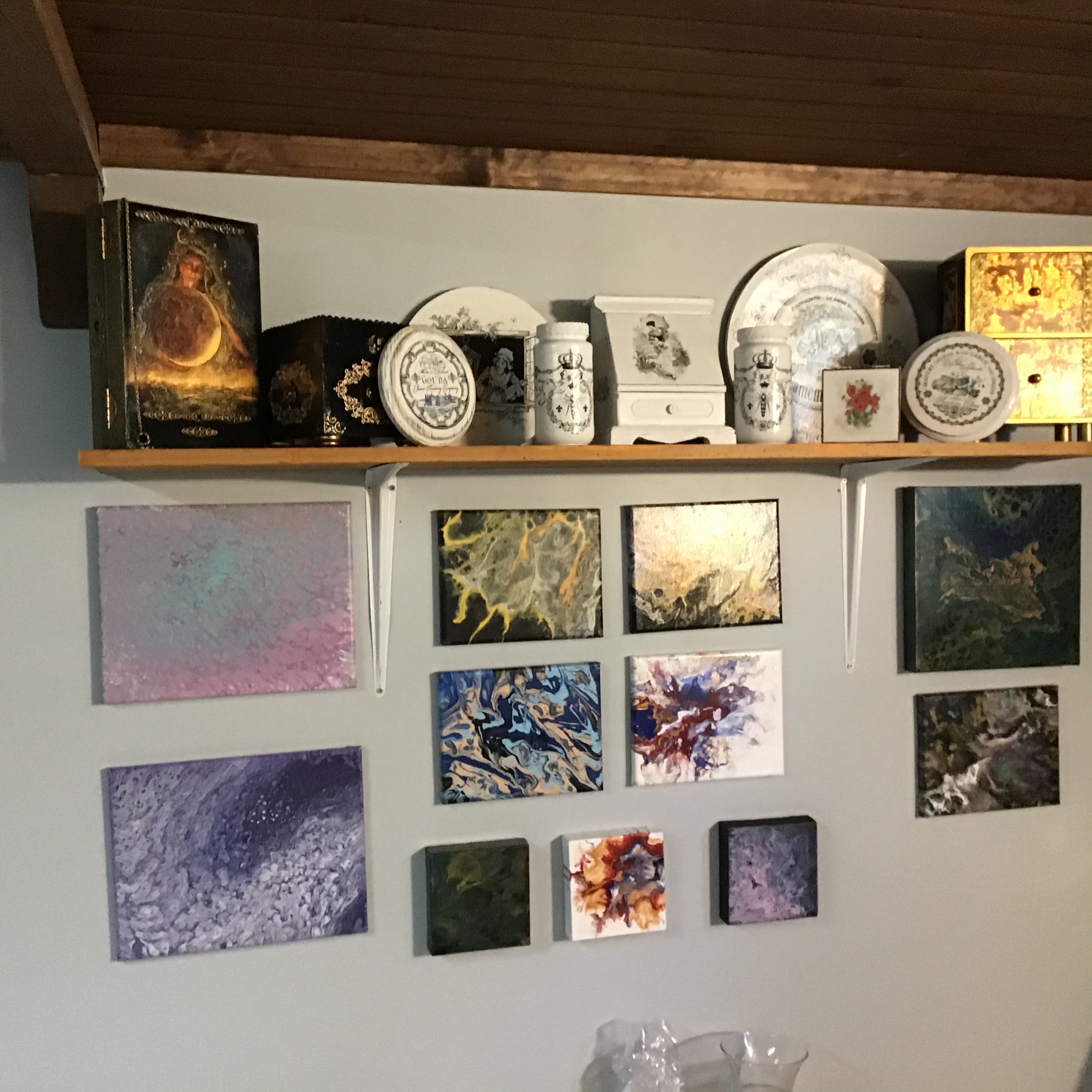 Ирочка-очень удачные у тебя эксперименты.Вот уже и начало Флюид-артной галереи положено!!! Полочка над ней с декупажными работами тоже заслуживает внимательнейшего любования.И как здорово, что место позволяет все так оформить и выставить даже пусть и для себя, хотя бы для дальнейшего осмысления проделанного.